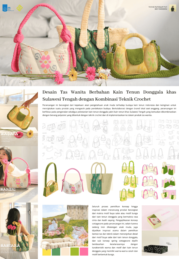 Penelitian ini bertujuan untuk mengembangkan desain tas wanita yang menggunakan kain tenun Donggala yang merupakan khas Sulawesi Tengah, dengan tambahan kombinasi teknik crochet. Desain ini memadukan keunikan kain tenun Donggala yang memiliki motif dan corak khas dengan keindahan dan kelenturan yang dihasilkan oleh teknik crochet. Metode penelitian ini terdiri dari tiga tahap, yaitu studi literatur tentang sejarah, proses produksi, dan karakteristik kain tenun Donggala, serta teknik dan penggunaan crochet dalam desain tas. Tahap berikutnya adalah pengumpulan data melalui observasi, wawancara dengan pengrajin kain tenun Donggala, dan penelusuran desain tas dengan teknik crochet yang sudah ada. Tahap terakhir adalah proses pengembangan desain tas dengan mempertimbangkan keunikan kain tenun Donggala dan teknik crochet. Hasil dari penelitian ini adalah desain tas wanita yang menggabungkan keindahan dan keunikan kain tenun Donggala dengan fleksibilitas dan estetika yang ditawarkan oleh teknik crochet. Tas ini dirancang dengan memperhatikan fungsi, ukuran, dan tata letak yang sesuai dengan kebutuhan pengguna. Selain itu, desain ini juga mencerminkan budaya dan warisan Sulawesi Tengah melalui motif dan corak khas kain tenun Donggala.
