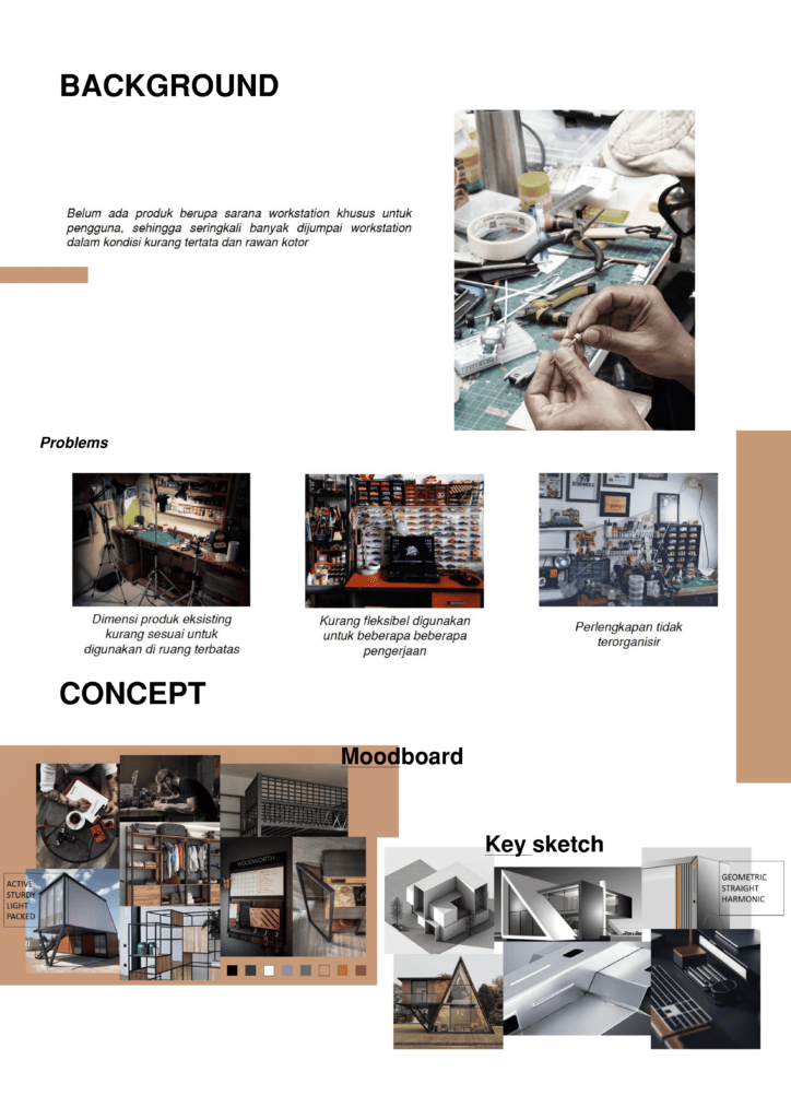 Customizer die-cast model dalam melakukan aktivitas custom die-cast model membutuhkan sarana workstation yang dapat menunjang pekerjaannya. Aktivitas pengguna di antaranya mulai dari pengonsepan hingga proses custom die-cast model yang meliputi proses modelling dan painting. Dari data yang didapatkan tentang produk eksisting yang digunakan oleh pengguna saat ini, baik melalui data primer dan data sekunder, kebanyakan jenis sarana workstation yang digunakan adalah meja kerja yang di-set-up untuk menunjang aktivitas pengguna. Ada beberapa permasalahan yang ditemukan pada produk eksisting yang digunakan oleh pengguna saat ini, diantaranya adalah kurang fleksibel untuk digunakan beberapa pengerjaan aktivitas custom die-cast model, perlengkapan yang digunakan oleh pengguna terlihat kurang terorganisir, dan kurang sesuai untuk digunakan di ruang terbatas.