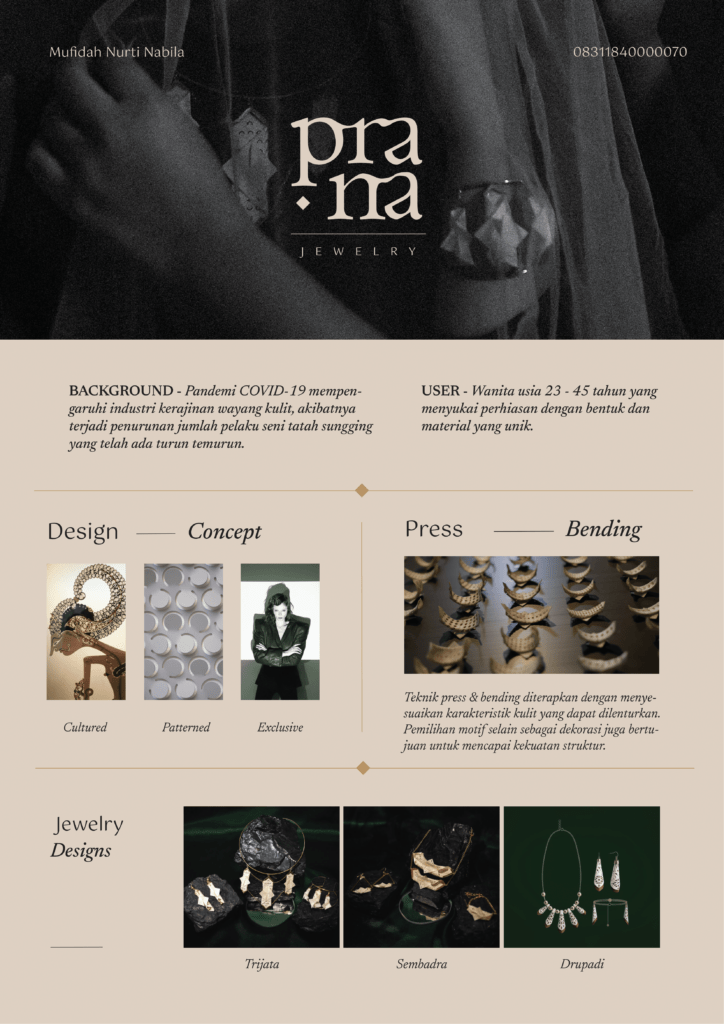 Kesenian Wayang Indonesia dinobatkan sebagai a Masterpiece of the Oral and Intangible Heritage of Humanity atau sebagai Karya Agung Budaya Dunia. Kesenian ini tersebar di pulau Jawa, Bali, dan Madura, sebagian besar berpusat di wilayah Imogiri, Bantul, DIY. Wilayah ini juga merupakan salah satu daerah penghasil dan penyebaran seni wayang kulit di Pulau Jawa. Seiring berjalannya waktu, COVID-19 di awal tahun 2020 memiliki dampak besar terhadap industri pariwisata yang dialami restoran, perhotelan, airlines, dan UMKM. Hal ini juga dirasakan oleh Desa Wukirsari, Kecamatan Imogiri, Bantul yang mengalami penurunan pengrajin tatah sungging yang didukung juga dengan hiburan yang lebih mudah dijangkau daripada wayang. Hambatan lain yang dialami Dukuh Cengkehan, Kecamatan Imogiri yaitu naiknya harga bahan baku kulit seiring dengan kebutuhan pokok, dan membutuhkan inovasi produk dengan bahan baku yang sedikit. Perancangan ini dilakukan untuk mengoptimalkan bahan kulit wayang yang memiliki motif tatahan dijadikan sebuah alternatif produk berupa perhiasan. Penerapan teknik press & bending diterapkan sebagai poin inovasi di penelitian untuk menunjang eksplorasi bentuk. Metode penelitian yang digunakan meliputi pengumpulan data primer dengan survey lapangan UMKM terkait, metode eksplorasi material, dan in-depth interview. Kemudian data primer yang telah didapat akan dianalisis untuk menentukan target pengguna yang dituju serta menentukan perlakuan material yang paling sesuai. Hasil yang didapatkan dari teknik ini adalah bentuk perhiasan kulit wayang yang lebih kompleks.