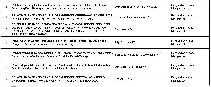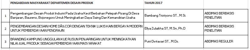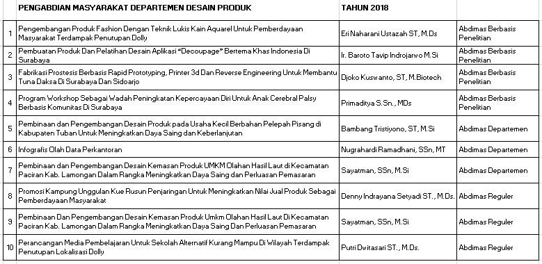 Kolaborasi sekaligus Pengabdian Masyarakat yang telah dilaksanakan oleh Departemen Desain Produk Institut Teknologi Sepuluh Nopember Surabaya dalam 3 tahun terakhir adalah sebagai berikut :