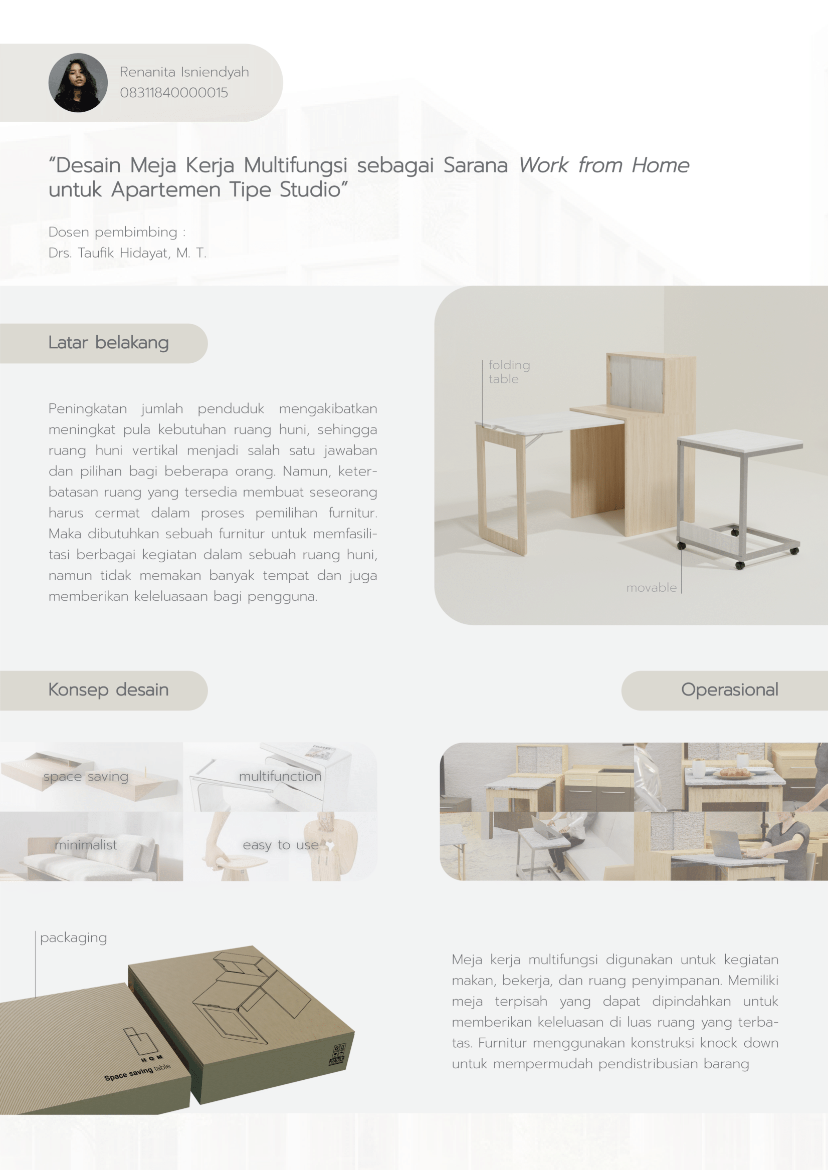 Beberapa apartemen juga tidak menyediakan tempat untuk bekerja dan makan. Perancangan ini memiliki tujuan untuk memfasilitasi kegiatan makan dan bekerja, serta memberikan ruang penyimpanan yang efektif di ruang huni terbatas. Pengumpulan data dilakukan dengan cara wawancara penghuni apartemen dengan ukuran 18-33 m2 dan observasi secara langsung terhadap denah apartemen dan arsitektural apartemen. Selanjutnya, menganalisa denah dan aktivitas penghuni sehingga menemukan permasalahan dan kebutuhan. Hasil akhir dari penelitian ini adalah desain meja hemat ruang multifungsi denan varian warna putih, krem bertekstur kayu, dan hijau. Meja utama akan digunakan untuk kegiatan makan, bekerja, dan sebagai ruang penyimpanan dengan ukuran saat tidak digunakan yaitu 600 x 600 mm dan panjangnya dapat mecapai 1200 mm saat meja lipat sedang digunakan. Terdapat meja tambahan di dalam meja utama yang dapat digunakan secara terpisah saat sedang melakukan kegiatan bekerja, sehingga masing-masing penghuni memiliki privasi saat bekerja dan memiliki fleksibilitas dalam menggunakan furnitur.