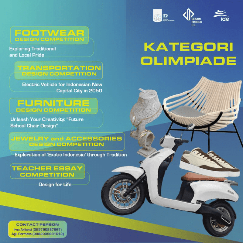 Departemen Desain Produk Institut Teknologi Sepuluh Nopember menghadirkan Olimpiade Desain Produk Nasional 2022 pertama di Indonesia. Bertujuan untuk mencari talenta muda Indonesia di bidang Desain Produk meliputi: Kompetisi Alas Kaki, Kompetisi Transportasi, Kompetisi Furnitur, serta Kompetisi Perhiasan dan Asesoris, juga Kompetisi Essay untuk para Guru tingkat SMA, MA, SMK sederajat.