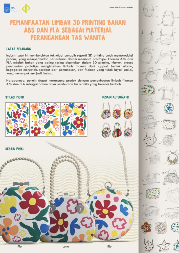 Industri saat ini membutuhkan teknologi canggih seperti 3D printing untuk memproduksi produk, yang mempermudah perusahaan dalam membuat prototipe. Filamen ABS dan PLA adalah bahan yang umum digunakan dalam 3D printing. Namun, proses pembuatan prototipe menghasilkan limbah filamen dari support bentuk utama, kegagalan mencetak, serabut dari pemanasan, dan filamen yang tidak layak pakai, yang menumpuk menjadi limbah. Penelitian ini bertujuan merancang tas wanita jenis hard-shell dengan mengeksplorasi limbah filamen ABS dan PLA yang dilelehkan bersama menggunakan oven listrik pada suhu sekitar 180-200 derajat Celsius. Proses ini mempertahankan kekuatan dan kerapatan dari polyblend untuk menghasilkan material berkualitas baik. Berbagai bentuk frame behel dipilih untuk memperkuat struktur tas, selaras dengan konsep desain dan kebutuhan pengguna akan estetika serta fungsionalitas. Selain itu, penulis memanfaatkan efek fluid pada lelehan polimer untuk mengembangkan motif yang diimplementasikan sebagai gaya “Matisse Cut-outs” untuk menambah estetika material.