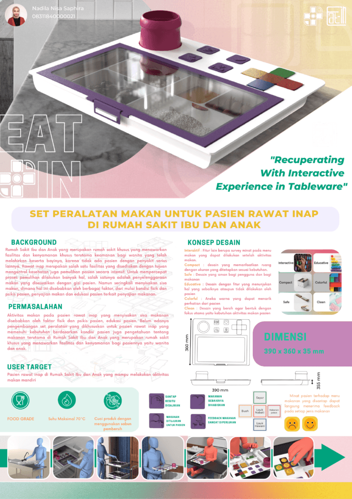 Aktivitas makan dilakukan untuk memenuhi kebutuhan gizi dalam kondisi sehat dan terutama apabila dalam kondisi sakit, kondisi sakit menjadi penyebab kondisi fisik yang melemah dan nafsu makan berkurang, sehingga menurunkan minat pada aktivitas makan, dan kesan pada aktivitas makan yang kurang menyenangkan, sedangkan aktivitas makan berfungsi untuk mempercepat proses pemulihan. Rumah Sakit Ibu dan Anak (RSIA) yang merupakan rumah sakit khusus dengan desain dan pelayanan yang memiliki kesan ramah dan hangat mengadakan fasilitas rawat inap bagi pasiennya Pihak penyelenggara makanan di Rumah Sakit Ibu dan Anak mengontrol kondisi pasien rawat inap dan menyajikan makanan dalam pembuatan siklus menu makanan dinilai perlu mendapatkan umpan balik dari pasien untuk dijadikan evaluasi pembuatan menu kedepannya. Tujuan dari perancangan ini adalah menjadikan penyajian makan sebagai salah satu cara untuk membuat pasien tertarik akan makanan, dengan memberi pengalaman baru pada aktivitas makan dan memberikan pihak RSIA umpan balik terkait menu makanan.
