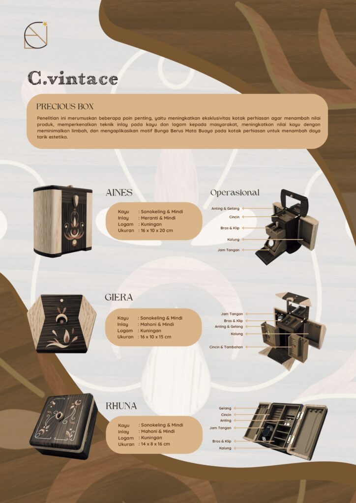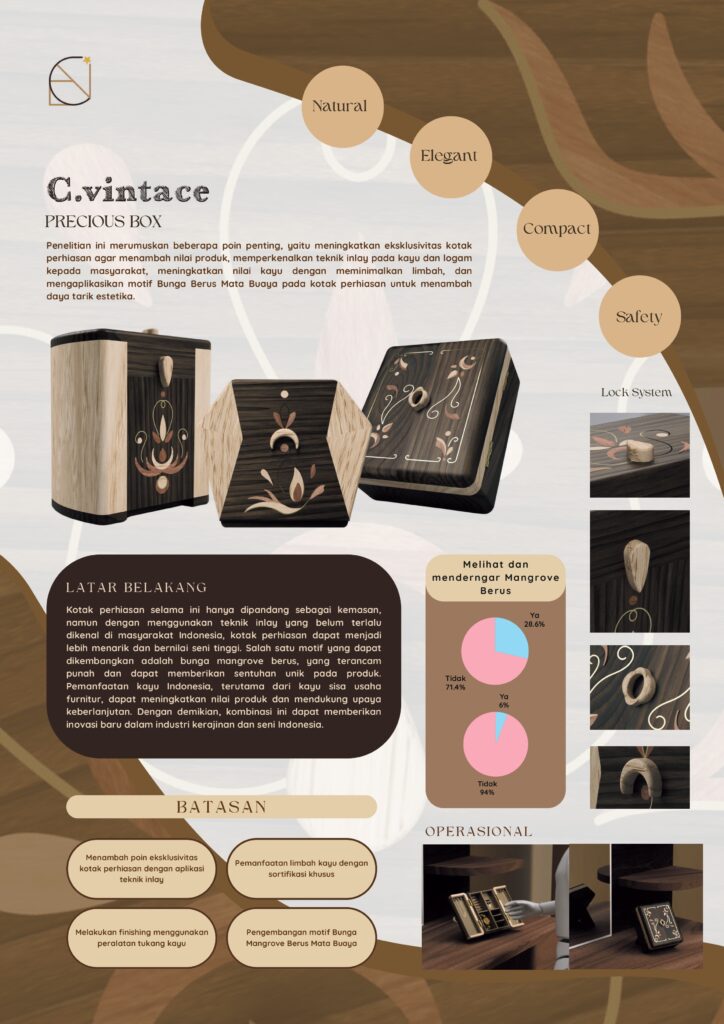 Pada era modern ini perhiasan tidak hanya menjadi aksesoris biasa, melainkan juga sebagai benda koleksi berharga dan untuk mengekspresikan identitas penggunanya, satu individu setidaknya memiliki lebih dari dua aksesoris atau perhiasan untuk melengkapi penampilan. Setiap tahunnya tren aksesoris dan perhiasan semakin bertambah dengan tujuan pemakaian yang berbeda sehingga memunculkan perilaku mengoleksi berbagai jenis perhiasan dimasyarakat. Seiring dengan meningkatkan konsumsi perhiasan dimasyarakat secara tidak langsung kebutuhan akan produk pendukung seperti kotak kemasan tentunya ikut meningkat, sayangnya produk pendukung seperti kotak perhiasan ini biasanya tidak akan digunakan lagi setelah pembelian produk dan hanya akan menjadi limbah. Kotak perhiasan sendiri memiliki beragam bahan dasar, seperti kayu, logam, kaca, plastik, atau kain, dan sering dihias dengan motif dekoratif. Dalam upaya merancang kotak perhiasan yang inovatif, penelitian ini mengambil inspirasi dari Bunga Mangrove Berus Mata Buaya (Acanthus ebracteatus). Penelitian ini akan memanfaatkan Teknik Inlay dalam membentuk motif Bunga Berus Mata Buaya. Melalui penelitian ini, diharapkan dapat mengembangkan desain motif baru yang terinspirasi oleh alam, meningkatkan pemahaman tentang penerapan Teknik Inlay, menambah alternatif produk kayu bernilai tinggi, dan memperkenalkan keindahan Mangrove Berus Mata Buaya kepada masyarakat. Produk kotak perhiasan ini ditujukan untuk wanita berusia 20-35 tahun yang memiliki minat dalam perhiasan.