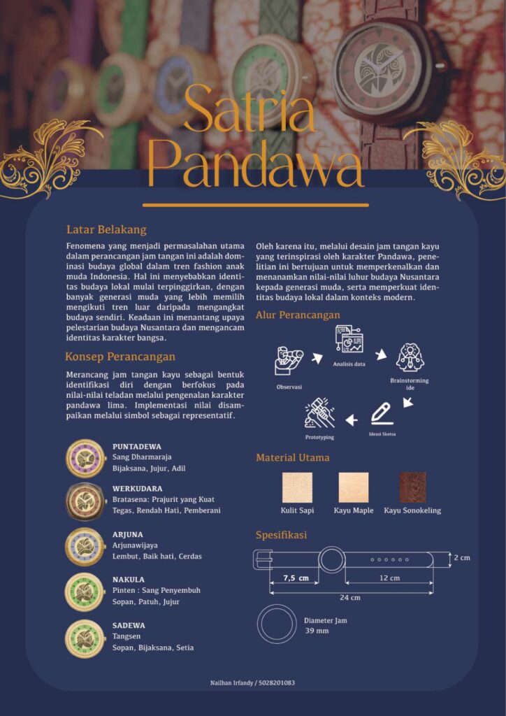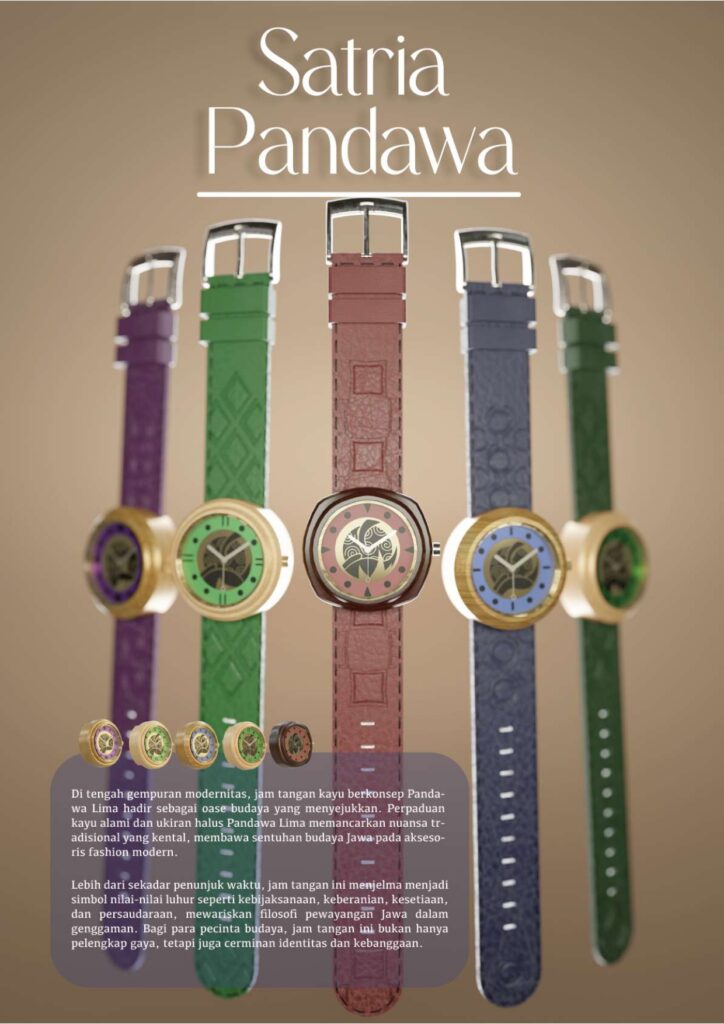 Sejalan dengan tren global, ekonomi kreatif di Asia Tenggara telah berkembang pesat dalam satu dekade terakhir. Indonesia, sebagai kontributor penting, mendukung pembangunan berkelanjutan di sektor ini. Menurut data Kementerian Pariwisata dan Ekonomi Kreatif tahun 2023, sekitar 90,48% sektor ekonomi kreatif di Indonesia diperkirakan akan tumbuh signifikan pada periode 2023-2024, dengan industri fashion sebagai salah satu sektor utama. Fashion berpotensi menjadi media komunikasi ekspresi pribadi, terutama bagi anak muda yang mencari jati diri melalui tren. Namun, dominasi tren global seringkali mengikis identitas karakter bangsa. Di sisi lain, tren budaya nusantara, seperti wayang kulit, mulai menarik perhatian. Wayang kulit, khususnya karakter pandawa yang merepresentasikan kebaikan, bisa menjadi contoh pembentukan karakter. Melihat peluang ini, desainer ingin memperkenalkan karakter pandawa melalui desain jam tangan kayu, guna memperkenalkan budaya dan membentuk karakter nusantara yang baik. Pengumpulan data dilakukan dengan metode kualitatif berdasarkan prinsip analisis design thinking, termasuk wawancara terstruktur untuk mengetahui preferensi dan aktivitas pengguna. Data diolah menggunakan teknik empathymap dan value proposition canvas. Hasil analisis menghasilkan desain yang berkesan cultural, geometric, authentic, dan expressivedengan desain alternatif mencakup tiga bentuk berbeda sesuai karakteristik masing-masing pandawa. Hasil penulisan ini berupa desain jam tangan kayu satria pandawa yang mampu mengekspresikan karakteristik nusantara.