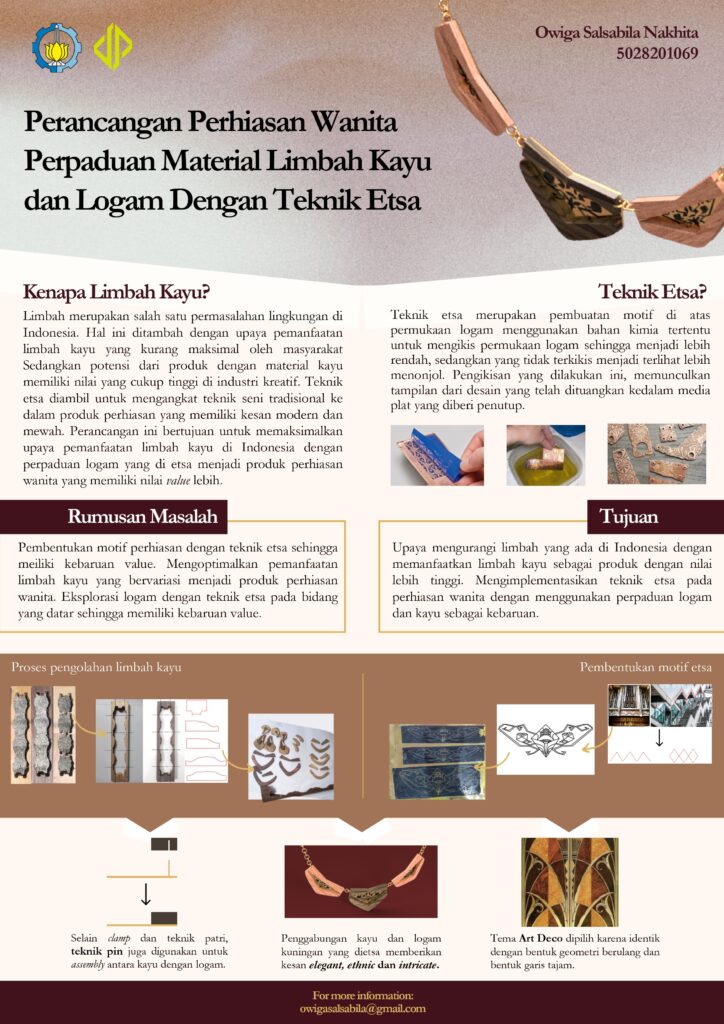 Limbah merupakan salah satu permasalahan lingkungan di Indonesia. Limbah kayu menjadi penyumbang limbah yang cukup tinggi terutama di daerah Jawa. Hal ini ditambah dengan upaya pemanfaatan limbah kayu yang kurang maksimal oleh masyarakat. Sedangkan potensi dari produk dengan material kayu memiliki nilai yang cukup tinggi di industri kreatif. Diawali dengan melakukan eksperimen memadukan material kayu dengan material pendukung berupa logam yang di etsa. Teknik etsa diambil untuk mengangkat teknik seni tradisional ke dalam produk perhiasan yang memiliki kesan modern dan mewah. Tahap penelitian dimulai dengan menentukan jenis-jenis limbah kayu yang akan dipadukan menjadi mahkota utama perhiasan. Eksperimen kemudian dilakukan dengan bahan logam untuk menemukan logam yang sesuai dengan kayu dan teknik etsa. Terakhir, eksperimen teknik etsa pada material logam yang akan dipadukan dengan material limbah kayu. Perancangan ini bertujuan untuk memaksimalkan upaya pemanfaatan limbah kayu di Indonesia dengan perpaduan logam yang di etsa menjadi produk perhiasan wanita yang memiliki nilai value lebih.