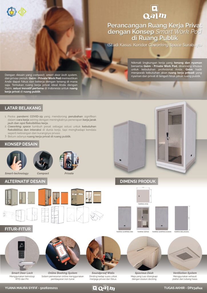 Pandemi COVID-19 mempengaruhi cara kerja global, memicu praktik Work From Home (WFH) dan pertumbuhan coworking space. Walaupun pandemi mempengaruhi bisnis, tren coworking space di Indonesia tetap berkembang. Coworking space dianggap sebagai opsi menjanjikan oleh responden yang melihatnya sebagai tempat kerja yang efisien dan nyaman. Namun, observasi di Koridor Coworking space menemukan kekurangan ergonomis dan aturan yang membatasi pengguna. Sehingga ada peluang pengembangan produk, seperti office pods, yang dapat meningkatkan produktivitas dan memberikan fleksibilitas dan privasi. Subjek perancangan ini merupakan sebuah ruang kerja privat dilengkapi dengan meja, kursi, dan fasilitas penunjang lain untuk ruang publik. Objek perancangan yang akan menjadi titik fokus dalam perancangan ini adalah desain berkonsep smart work pod yang dapat menjadi ruang kerja yang kondusif di ruang publik. Skema alur perancangan merupakan diagram yang memperlihatkan langkah-langkah dan keputusan untuk melakukan sebuah proses. Dalam penelitian ini, metode design thinking yang diimplementasikan berupa lima tahap perancangan (empathize, define, ideate, prototype, test). Hasil pengamatan di Koridor Coworking space menunjukkan bahwa kebanyakan ruang kerja eksisting memiliki struktur yang kurang ergonomis. Letak stop kontak yang terletak pada tengah-atas meja mengurangi ruang yang tersedia, dan bagian bawah meja terlalu sempit, mengurangi kenyamanan pengguna dalam posisi duduk. Selain itu, aturan ketat dalam penggunaan ruang membatasi aktivitas individu memberikan rasa kurang nyaman bagi beberapa pengguna. Berdasarkan temuan tersebut, dirumuskan beberapa kesimpulan dan rekomendasi. Perancangan workstation baru harus memperhatikan faktor-faktor ergonomis untuk meningkatkan kenyamanan dan produktivitas pengguna. Desain kompak dan sistem knock-down dapat diintegrasikan untuk memberikan fleksibilitas dalam penataan ruangan. Selain itu, kebijakan penggunaan ruang perlu dipertimbangkan lebih lanjut untuk menciptakan lingkungan yang lebih inklusif dan mengurangi rasa tekanan yang dirasakan oleh pengguna.