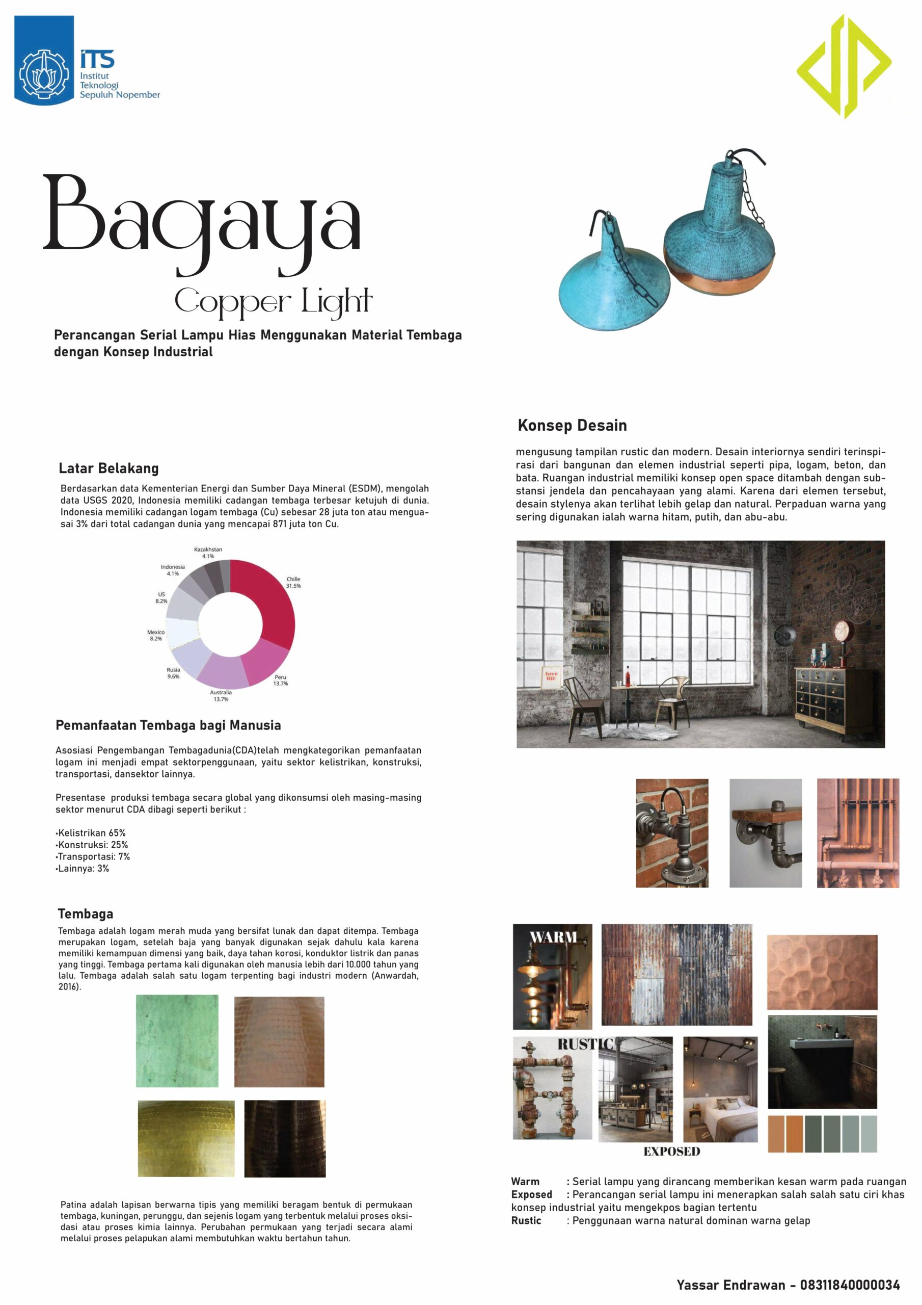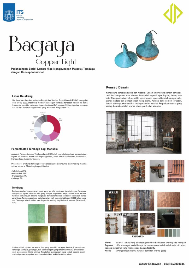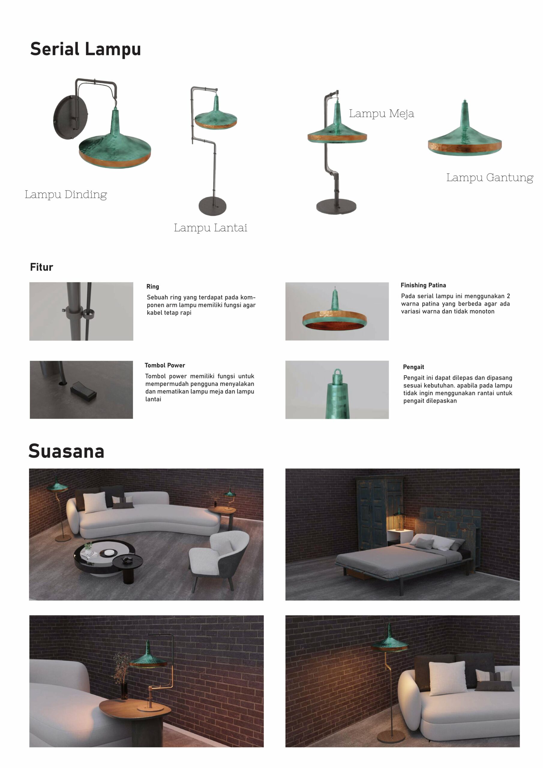 Indonesia termasuk dalam kategori tujuh negara dengan cadangan tembaga terbesar di dunia. Menurut Asosiasi Pengembangan Tembaga dunia (CDA) penggunaan tembaga paling banyak pada sektor kelistrikan dan sektor konstruksi. Sedangkan hanya sekitar 3% penggunaan pada sektor tembaga pada sektor kerajinan. Walaupun penggunaan tembaga dalam sektor kerajinan masih diangka 3% apabila tembaga diolah dengan baik maka tembaga dapat menjadi material yang memiliki nilai jual tinggi. Tembaga memiliki sifat alami yang unik, memiliki daya tahan, dan keindahan estetika. Salah satu Desa yang telah memanfaatkan tembaga sebagai material utama kerajinan adalah Desa Tumang yang terletak di Boyolali, Jawa Tengah. Pemanfaatan tembaga sebagai material kerajinan sudah turun temurun sehingga banyak Masyarakat tumang yang berprofesi sebagai pengrajin tembaga. Produk yang dihasilkan di Desa Tumang mulai dari vas bunga, mangkok, wastafel, hiasan dinding, patung, kubah masjid dan lampu gantung. Proses pembuatan kerajinan tembaga ini masih menggunakan perbaduan cara tradisional. Pembentukan dengan cara tradisional akan menghasilkan tekstur pada tembaga yang natural sehingga menjadi keunikan tersendiri. Selain itu, daya tarik utama dari produk ini nantinya adalah warna tembaga yang sudah mengalami oksidasi. Dari fenomana ini muncul ide untung menghasilkan seri lampu hias yang menggunakan material utama tembaga yang menggunakan dasar ilmu desain produk. Hasil akhir nantinya berupa seri produk lampu, seperti lampu gantung, lampu meja, lampu lantai, dan lampu dinding, yang diharapkan mampu memenuhi kebutuhan pasar.