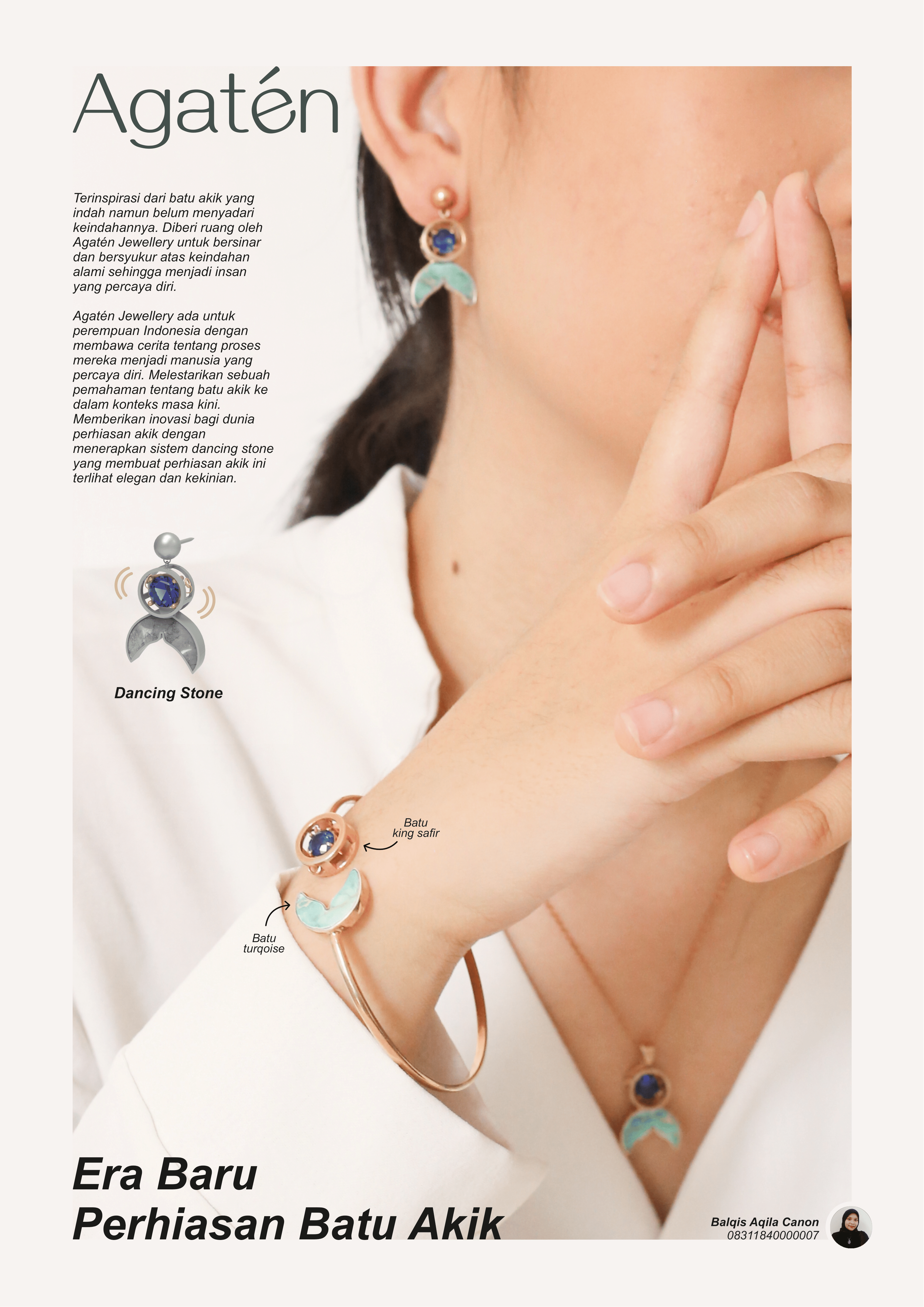 Pemanfaatan batu akik sebagai material perhiasan saat ini berfokus kepada komunitas pecinta batu yang didominasi oleh laki-laki dengan usia 40 tahun ke atas. Sedangkan populasi terbanyak dan paling berpotensi pada bidang ekonomi perhiasan saat ini adalah generasi Z. Tetapi, ketertarikan generasi Z terhadap perhiasan akik masih sangat rendah. Karakteristik dan stigma negatif tentang batu akik yang mistis dan kuno menjadi alasan masih sedikitnya generasi Z yang mau dan bersedia memakai perhiasan batu akik. Dilatar belakangi hal tersebut, timbul rasa ketertarikan penulis untuk merancang produk perhiasan batu akik yang berorientasi kepada karakteristik generasi Z untuk mengolah bentuk visual perhiasan batu akik berupa pemanfaatan mekanisme gerak dancing stone demi meningkatkan daya tarik visual terhadap perhiasan akik tanpa harus mengeluarkan biaya yang tinggi.