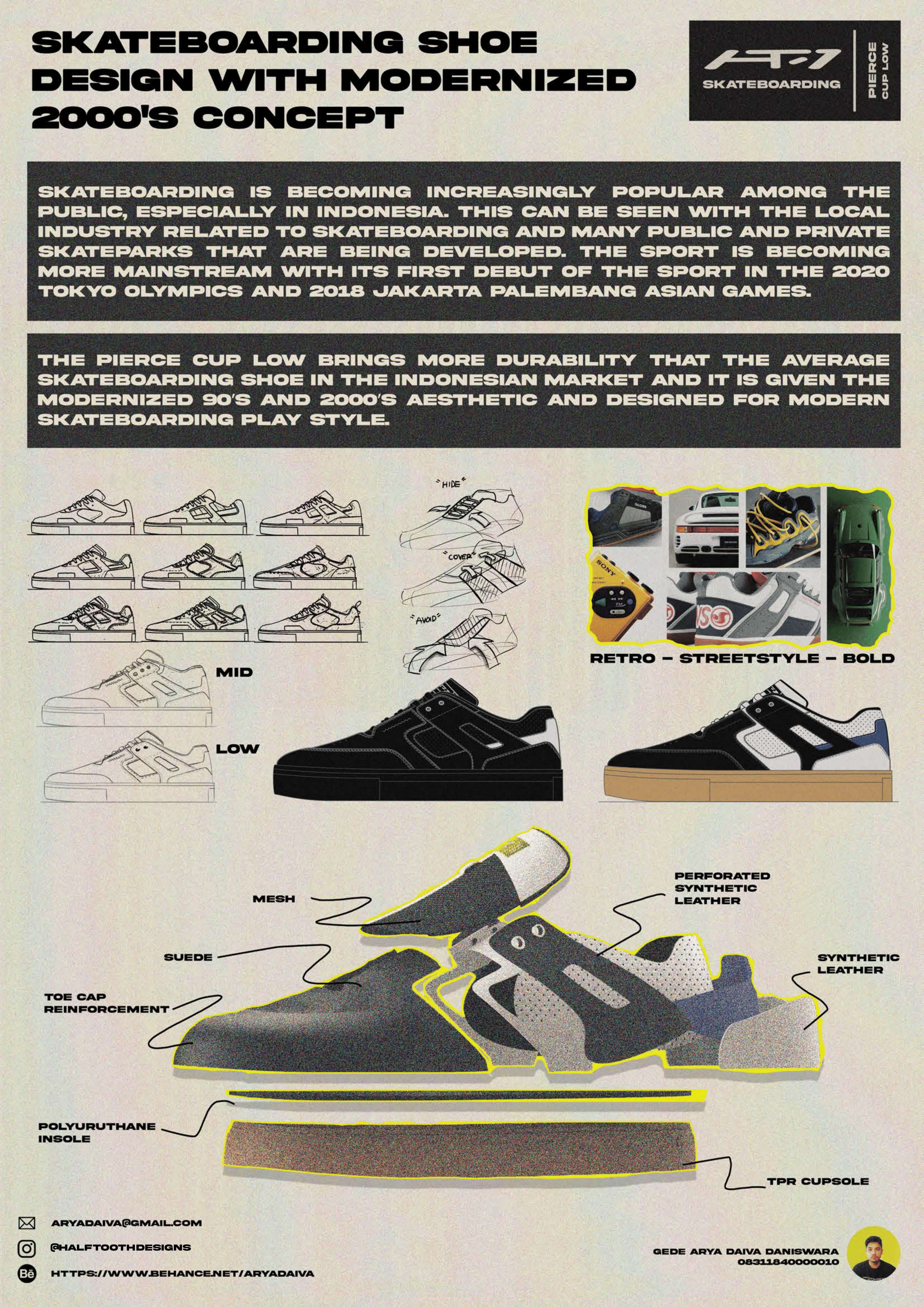 Popularitas olahraga ini semakin meningkat di kalangan masyarakat sejak ditampilkan pertama kali di ajang olimpiade Tokyo 2020 dan Asian Games 2018 yang diselenggarakan di Indonesia. Dengan meningkatnya olahraga skateboarding dengan demand market produk-produk skateboard, penulis melihat peluang untuk membuat sebuah sepatu yang dapat menunjang kebutuhan pemain skateboard Indonesia di kategori streetstyle. Konsep Modernized 2000s memberikan estetika sepatu skateboard retro era 2000an dan 90an yang mengikuti tren sepatu sneakers yang terkini dengan fiturfitur yang modern. Konsep tersebut menghadirkan sepatu skateboard dengan durabilita sebagai hal utama yang ingin di tingkatkan tanpa menghilangkan performa untuk kebutuhan pemain skateboard streetstyle.