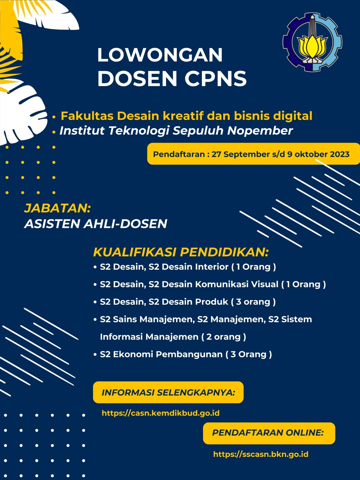 The ITS Faculty of Creative Design and Digital Business has opened CPNS Lecturers. Registration starts September 27 to October 9, 2023.