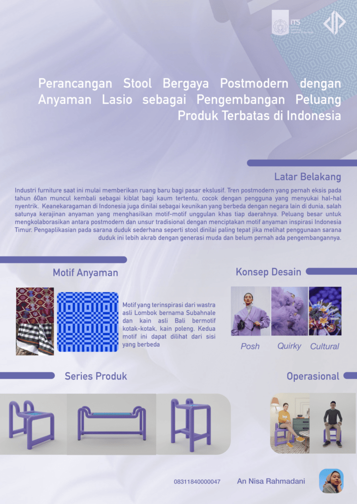 The design style that is often used as a reference for this limited edition product is dominated by a postmodern style in which the design does not have rules, starting from shape, material, to color selection, which is carried out through exploration and the designer’s imagination. It was carried out by collecting data starting from literature studies such as the definition of stool and its types, reviewing postmodern design styles and their application to furniture products, wicker characteristics and supporting materials, conducting in-depth interviews with target users with middle to upper financial levels to find out their tastes and desires. .