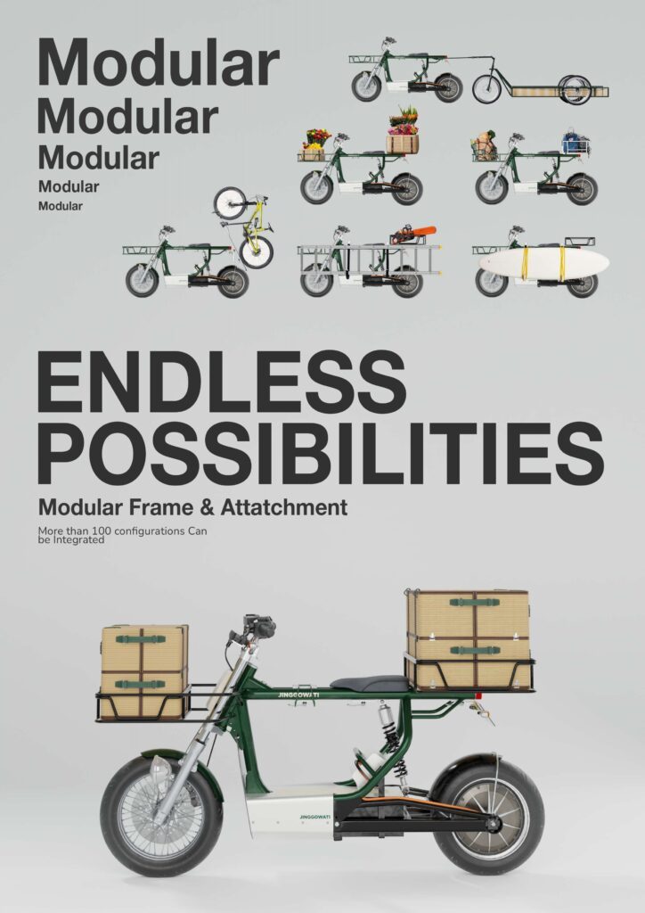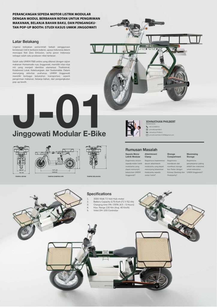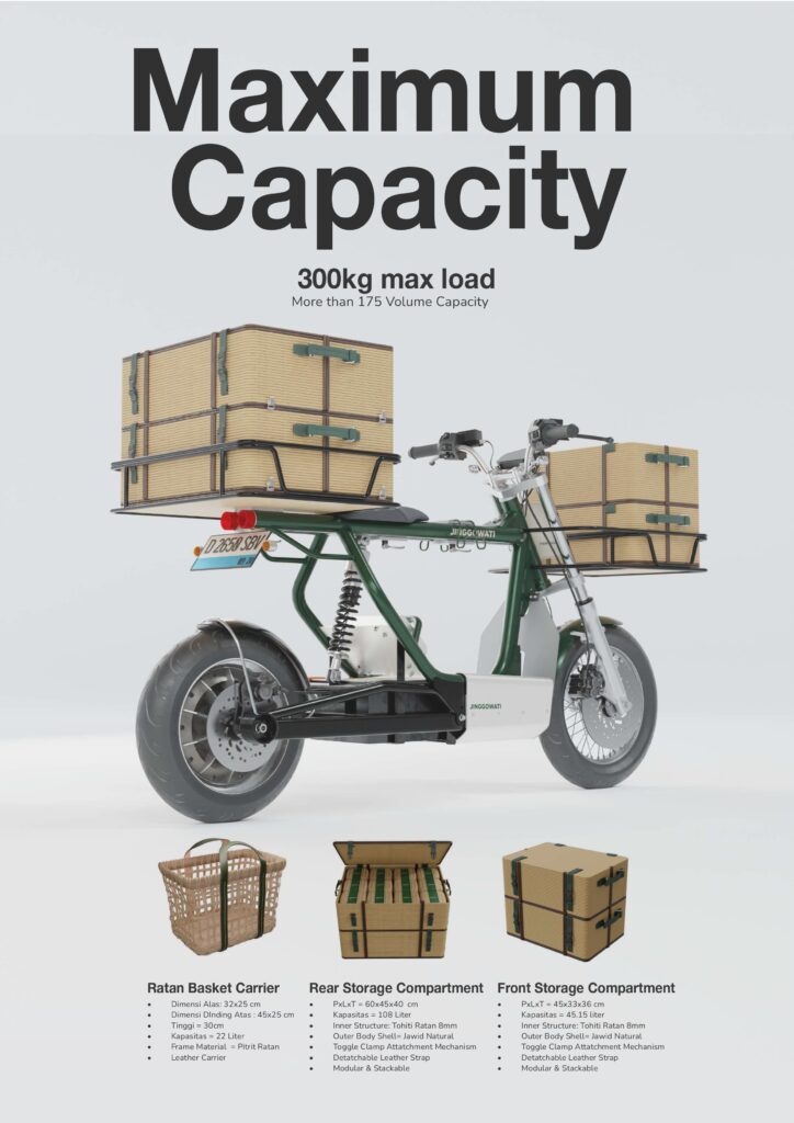 The background highlights the urgency of government policies regarding the use of battery-powered electric vehicles, Indonesia’s efforts to achieve Net Zero Emissions, and Indonesia’s role as one of the largest nickel producers. Jinggowati, an online F&B SME known for its homemade food, upholds core values that define its identity: Traditional, Local Collaboration, Family, and Sustainability. Established in 2020, this local company continues to strengthen its position in an increasingly competitive market through innovations that support these core values. To support its business activities, Jinggowati SME has various transportation needs, such as food delivery, ingredient shopping, and transporting pop-up booths. However, there are numerous challenges in meeting these transportation needs. The methods used to identify these problems include deep interviews, shadowing, and Customer Journey Mapping. The design method employed is Design Thinking. The design concepts of sustainability, modularity, and local genius were formulated based on the needs and problems analysis faced by Jinggowati SME. This resulted in the prototype of a modular electric motorcycle that can meet various needs of Jinggowati SME, a modular attachment system on the motorcycle frame, storage box modules made of rattan with stacking and modularity design systems, and an analysis of the most effective and maximum storage capacity for Jinggowati SME’s needs. Collaborating with Jinggowati SME, Avisindo, a rattan craftsman company based in Cirebon, and Lembinc Custom, a renowned custom motorcycle workshop in Indonesia’s automotive world, aims to realize a design concept that meets the needs of Jinggowati SME. With this innovation, the resulting electric motorcycle will accommodate the various business activities of Jinggowati, integrating them into a single environmentally friendly, functional transportation tool that reflects Jinggowati’s values.