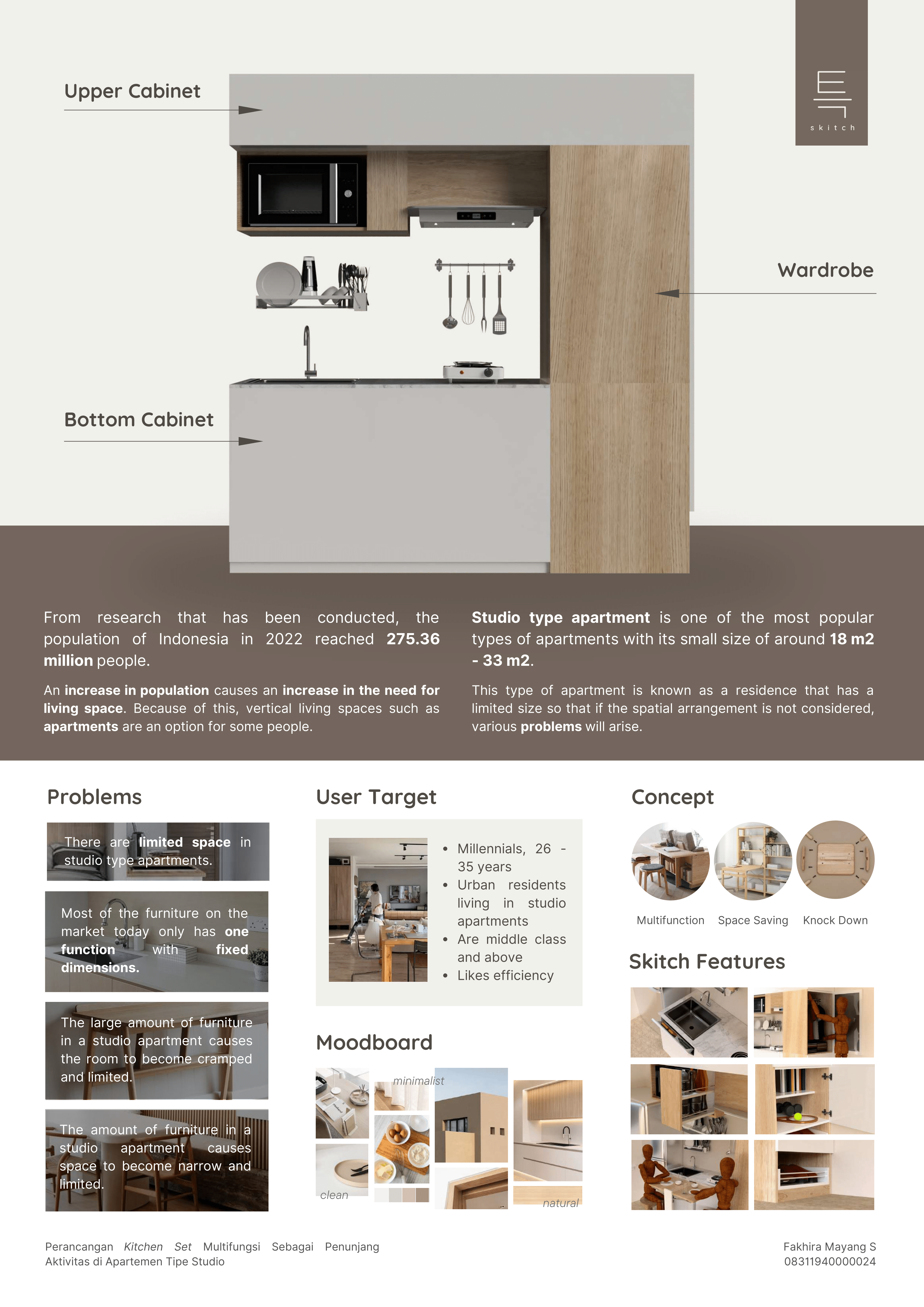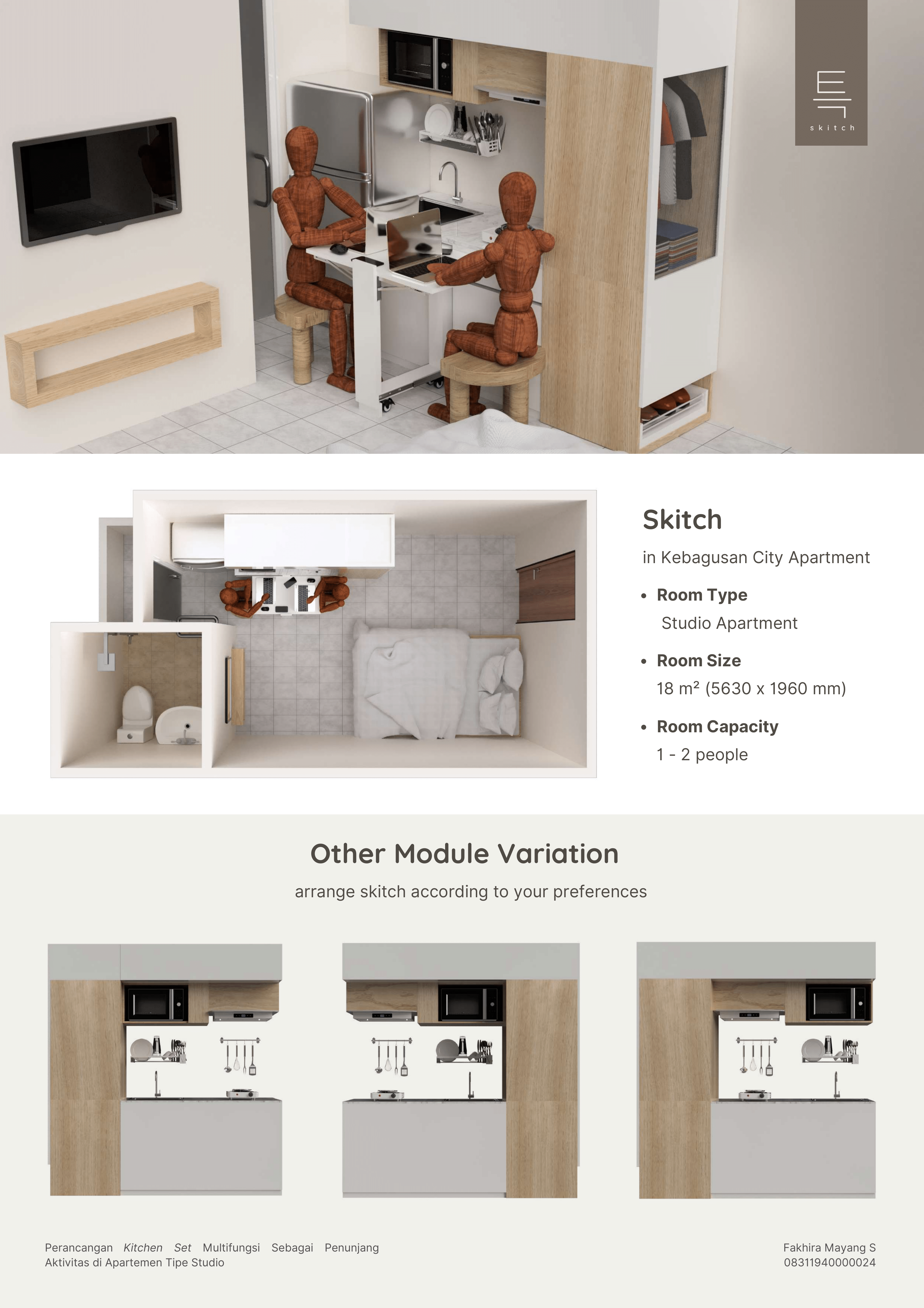 This design has the goal of facilitating cooking, eating and working activities comfortably and effectively in the same area without making the room feel cramped or messy. Data collection was carried out by means of semi-structured interviews with 3 apartment residents and apartment observations. Then an analysis of the plan and the activities of the occupants is made in order to find their problems and needs. From this analysis, the final results of the study were obtained, namely the design of a space-saving multifunctional kitchen set equipped with an additional adjustable table to accommodate 1-2 people. This additional table can later be removed when the user wants to use it for eating, working, or other activities that require a table.