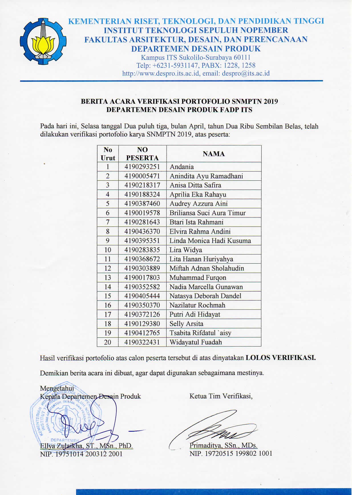 Announcement of Portfolio Verification Results of 2019 SNMPTN of Product Design Department – FADP ITS Surabaya