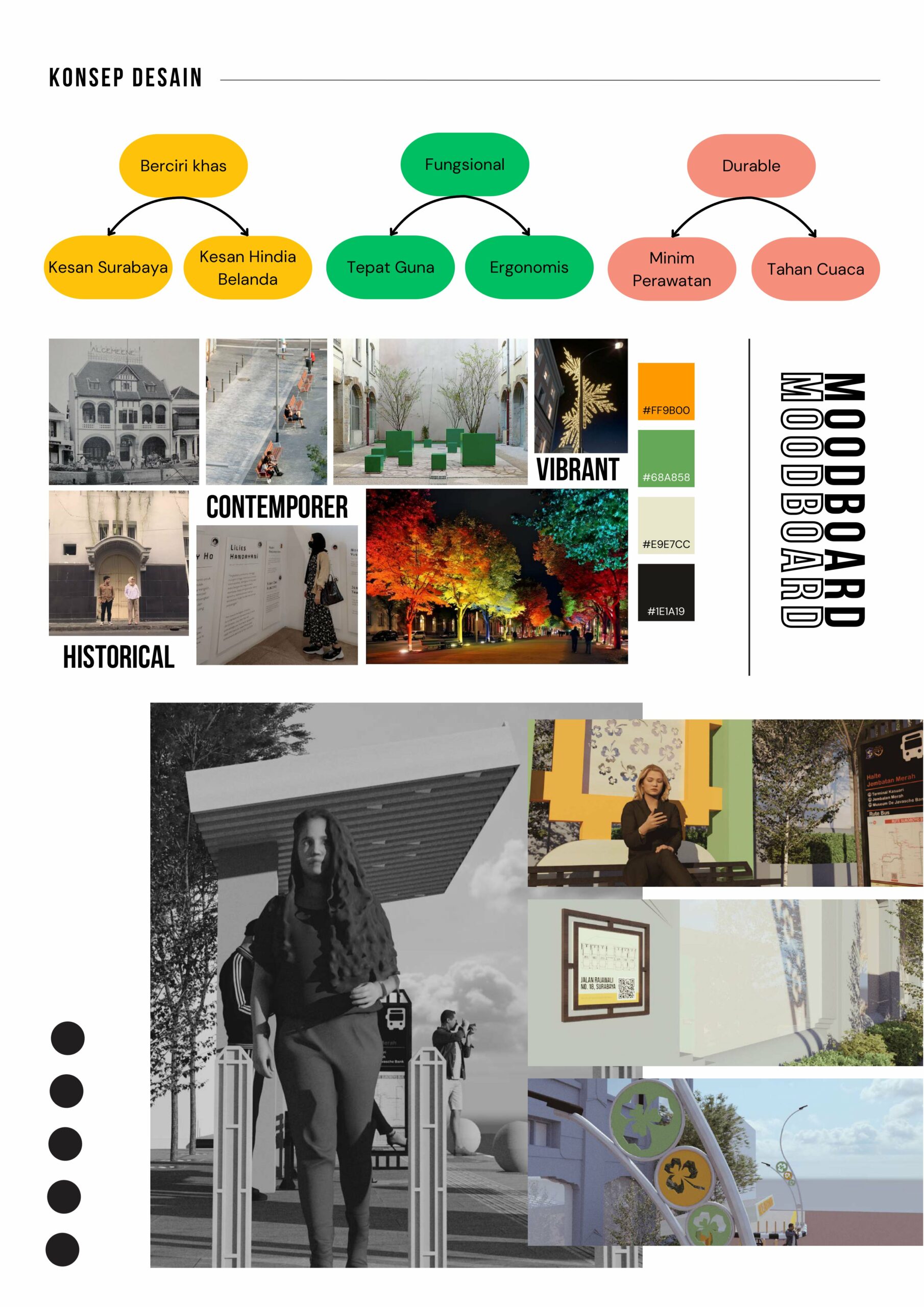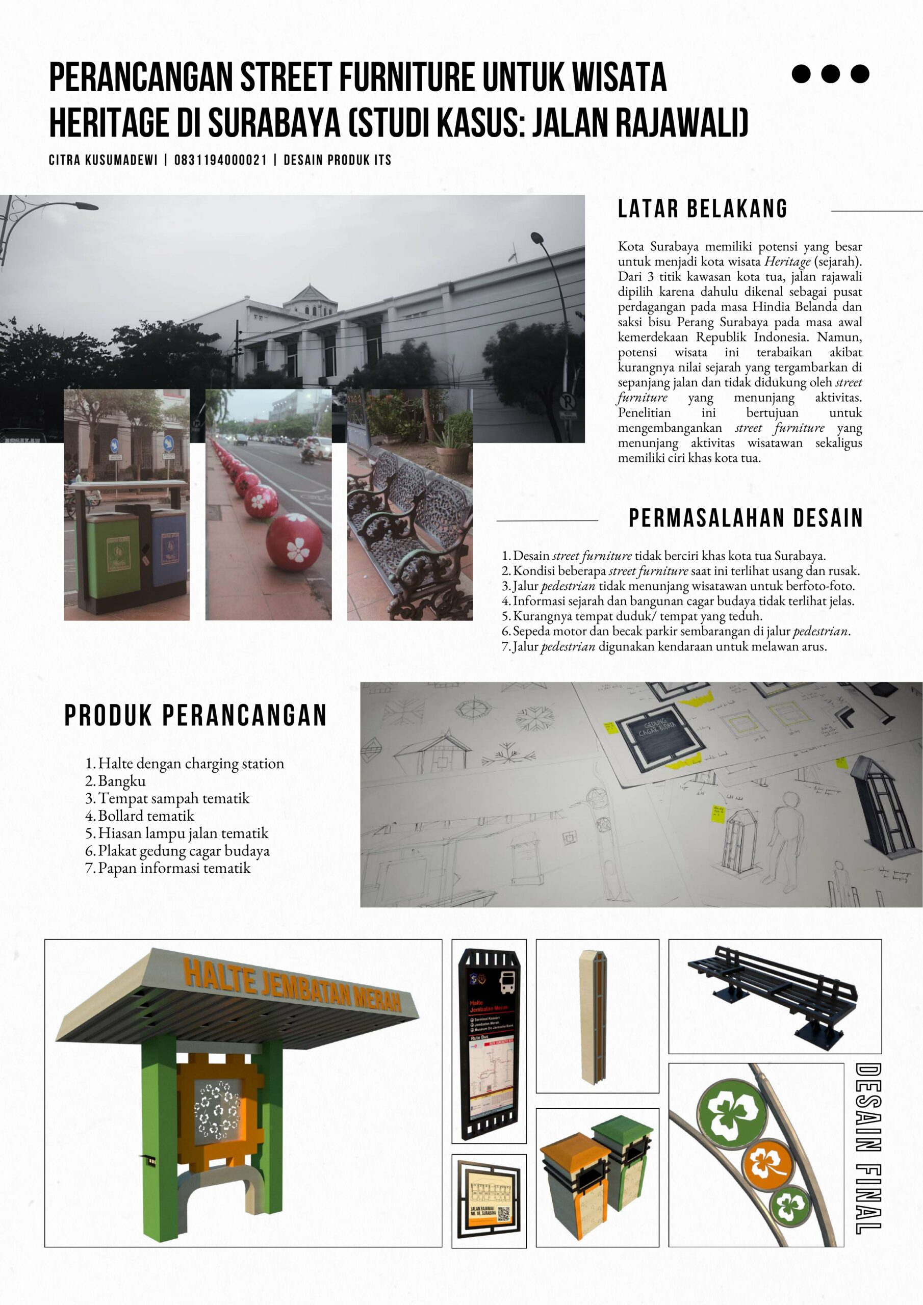 The city of Surabaya has excellent potential to become a “heritage” (historical) tourism destination. Of the 3 places in the old town area, Jalan Rajawali was chosen because of the road’s history as a trading center during the Dutch East Indies era and as a silent witness to the Battle of Surabaya during the early days of the Republic of Indonesia’s independence. However, this tourism potential is neglected due to the lack of historical value depicted along the street and not well-supported by street furniture to support tourist activities. This research aims to develop street furniture that supports tourist activities as well as having the historical of an old city of Surabaya. The method that used is the double diamond method. Starting from the discover stage by conducting literature studies, field surveys, and semi-structured in-depth interviews and which are then summarized into persona. Followed by define, develop, deliver stages to determine the needs and design concepts. The design concept is based on the colonial building style (Dutch East Indies) of the Verzekerings Maatschappij Building or Lion Building. The building shapes taken are in the form of windows (dower windows), balcony pillar shapes, and arch door shapes. From this formation, 5 alternative design series were created. The five designs were selected and the result was a design for 1 series of street furniture in the form of a bus stop with a charging station, benches, thematic trash cans, thematic bollards, thematic street lights, cultural heritage building plaques, and information boards on the history of the Surabaya War inspired by the Lion Building with inspired window shapes (dower window).