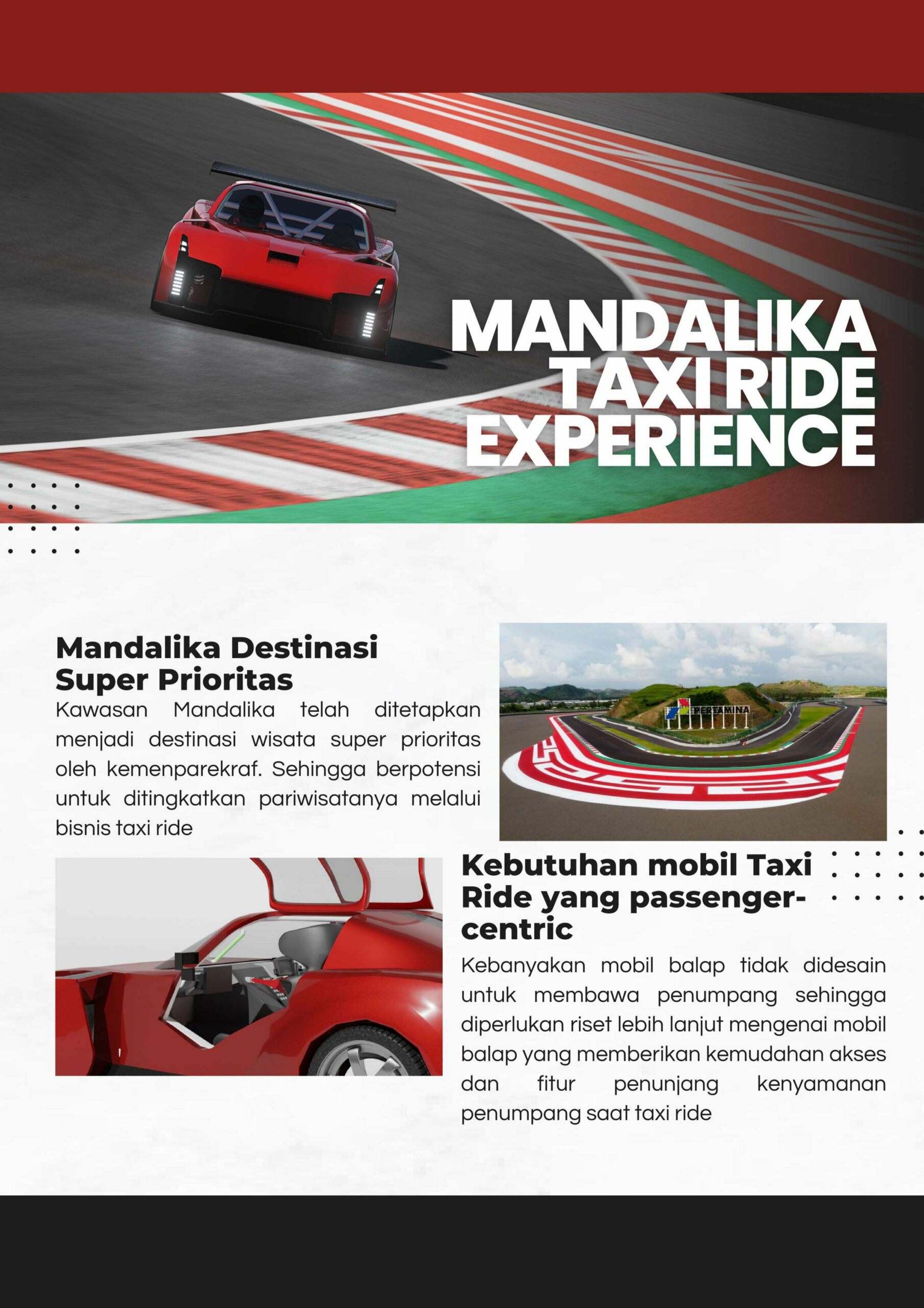 Motorsports are rapidly growing in Indonesia in line with the development of the automotive industry, marked by the arrival of international races such as Formula E and WRC. According to the official Formula E website, it is recorded that 13.4 million people watched the race from all over Indonesia during the Jakarta E-Prix in 2022. Based on this phenomenon, there are business opportunities and chances to increase public interest in car racing through Taxi Ride at the circuit. However, most Taxi Ride cars are not designed with passengers in mind. Therefore, a new design is needed that provides operability similar to race cars, while also considering passengers’ needs to enhance the experience. Data were collected through three days of observation and Deep interviews involving one racing car driver and two Taxi Ride passengers. The collected data was further analyzed using the Persona method to determine the appropriate styling and Customer Journey Mapping to formulate the Design Requirement and Objective (DRNO). The proposed concept involves a racecar with a space frame construction for easy maintenance, featuring a front engine layout and rear-wheel drive for improved car control, and the car will adopt the latest styling trends inspired by the endurance category.