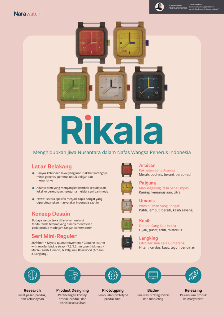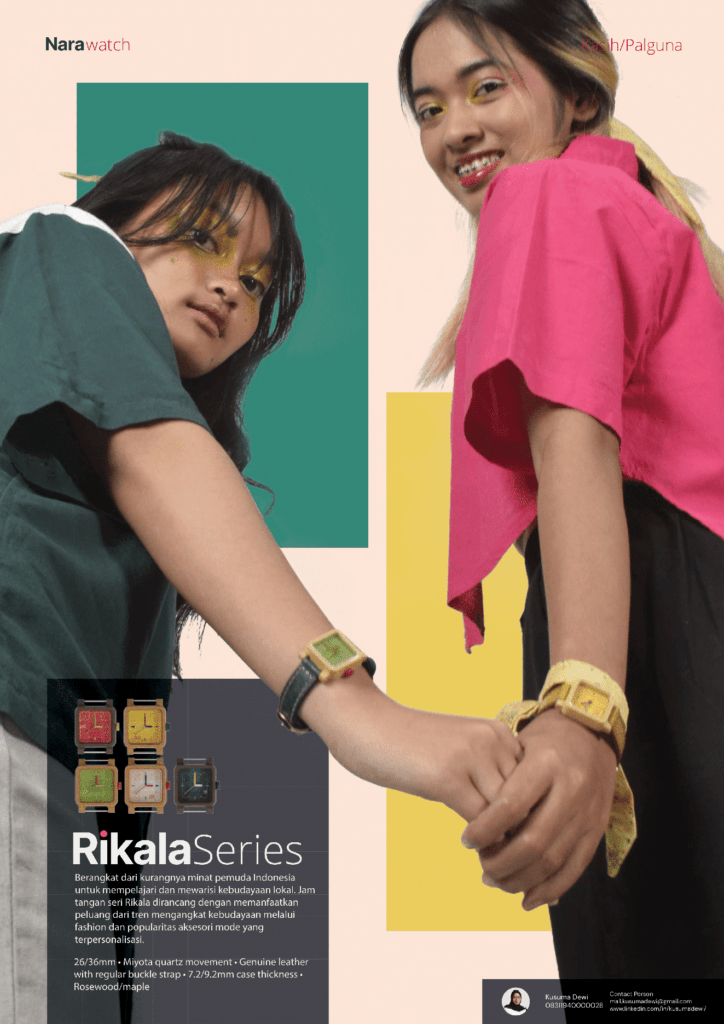 Indonesia is a country rich in cultural diversity, unfortunately many local cultures are fading due to the lack of interest of young people to learn and inherit them. According to BPS data in 2010, there are 1,340 ethnic groups in Indonesia, with the largest ethnic group being the Javanese, which makes up 41% of the total Indonesian population. On the other hand, awareness is starting to grow to revive local culture that was previously abandoned through fashion. Seeing this phenomenon, there is an opportunity to introduce local culture through fashion products that also convey the meaning and philosophy being introduced. Semi-structured in-depth interviews were conducted to understand user needs. The results of interviews and secondary data that have been collected are processed using design thinking principles. It was found that users like unique personalized products to express and show their identity. Watches that highlight Javanese weton culture are considered appropriate media because they support phenomena and trends that are currently echoing among Indonesian youth. The design philosophy was prepared on the basis of Javanese primbon which was researched with local foundations and cultural figures. The design is made by sketching, followed by 3D modeling, manufacturing, and business model design as a strategy for delivering the product to target users. The market test results at the exhibition showed a positive response from the public and it is known that the signs embedded in the design succeeded in sparking youth’s curiosity about Weton Jawa.