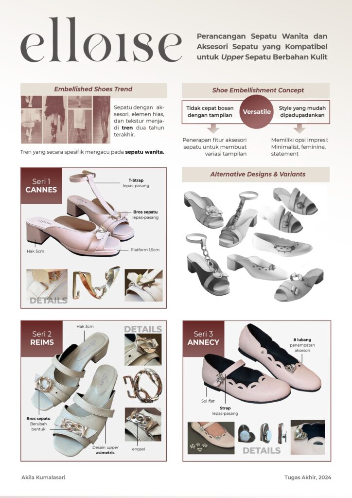 Shoes are one of the essential needs that not only support the safety and comfort of humans in their activities, but also complement the appearance of its users. One of the important aspects considered in designing shoes is accessories, embellishments, or decorative ornaments. The development of trends in women’s footwear products also includes the addition of accessories and decorations, which support the mindset of women in expressing themselves through fashion. In line with these conditions, the Indonesian Minister of Industry, Mr. Agus Gumiwang, said that the leather industry, which includes finished goods and footwear, grew positively by 13.12 percent in the second quarter of 2022. In this design, one of the potentials that will be developed for the leather footwear industry is by exploring and adding accessories as a form and identity and medium of expression of its users. By using the literature study method and analyzing the preferences of target users, it is found that one of the attractions of accessories lies in its application as a feature on the product. With the addition of the convertible feature, users are not easily bored with the look of the shoes and feel involved in choosing their appearance. Furthermore, using the methods of experimentation, design development, prototyping, and product testing, three series of women’s shoe designs with a variety of shoe accessory features were produced, whose concepts were tailored to the target users.