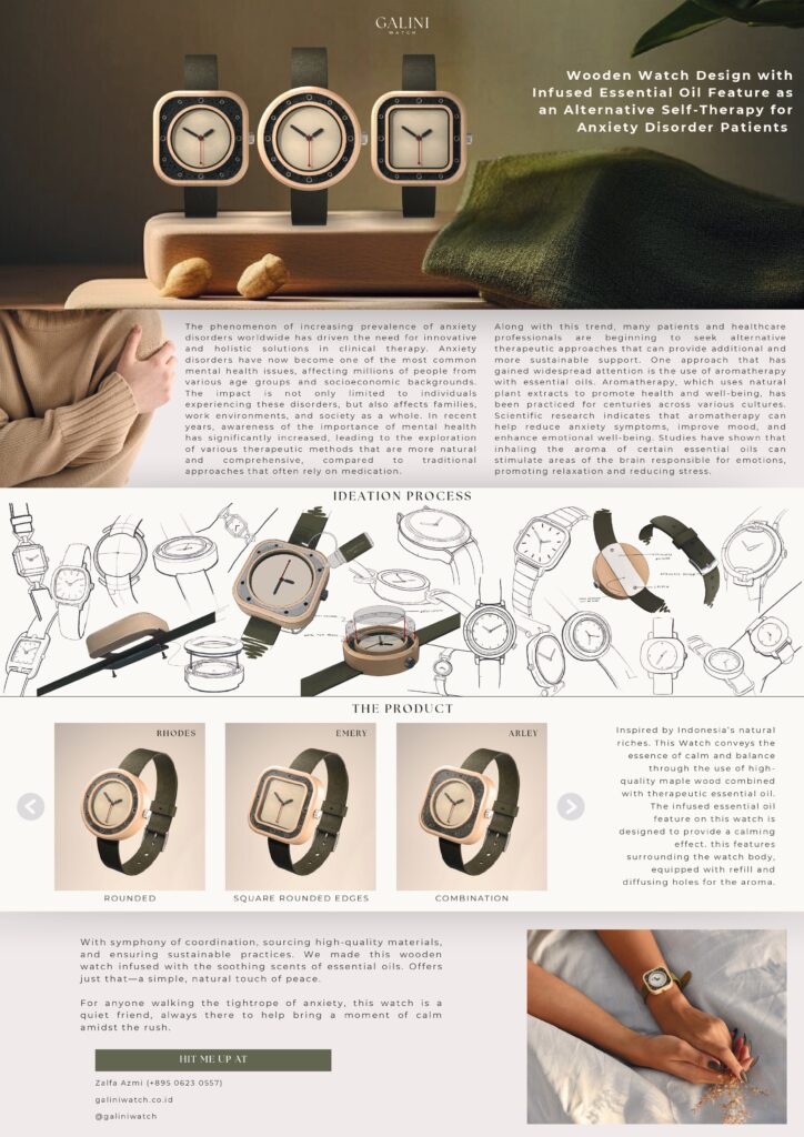 More than 19 million individuals over the age of 15 in Indonesia experience emotional mental disorders. In addition, 5.5% of Indonesian teenagers are diagnosed with mental disorders. Aromatherapy has emerged as a beneficial alternative therapy to clinical treatment, particularly for distracting sudden anxiety episodes. However, in daily life, individuals with anxiety disorders often find it challenging to consistently access aromatherapy. This presents an opportunity for developing fashion products with a medical application. Research findings indicate that lava stone is the best material for absorbing essential oils. Additionally, the integration system of lava stone with wooden watches is designed using a build-in system on the watch body. This design utilizes methods such as literature review, user preference study, experimentation, design development, prototyping, and product testing. The final result of this design includes three series of wooden watches with tailored concepts and complementary attributes. This research aims to improve the quality of life for patients with anxiety disorder by reducing the negative impacts of anxiety through fashion products.