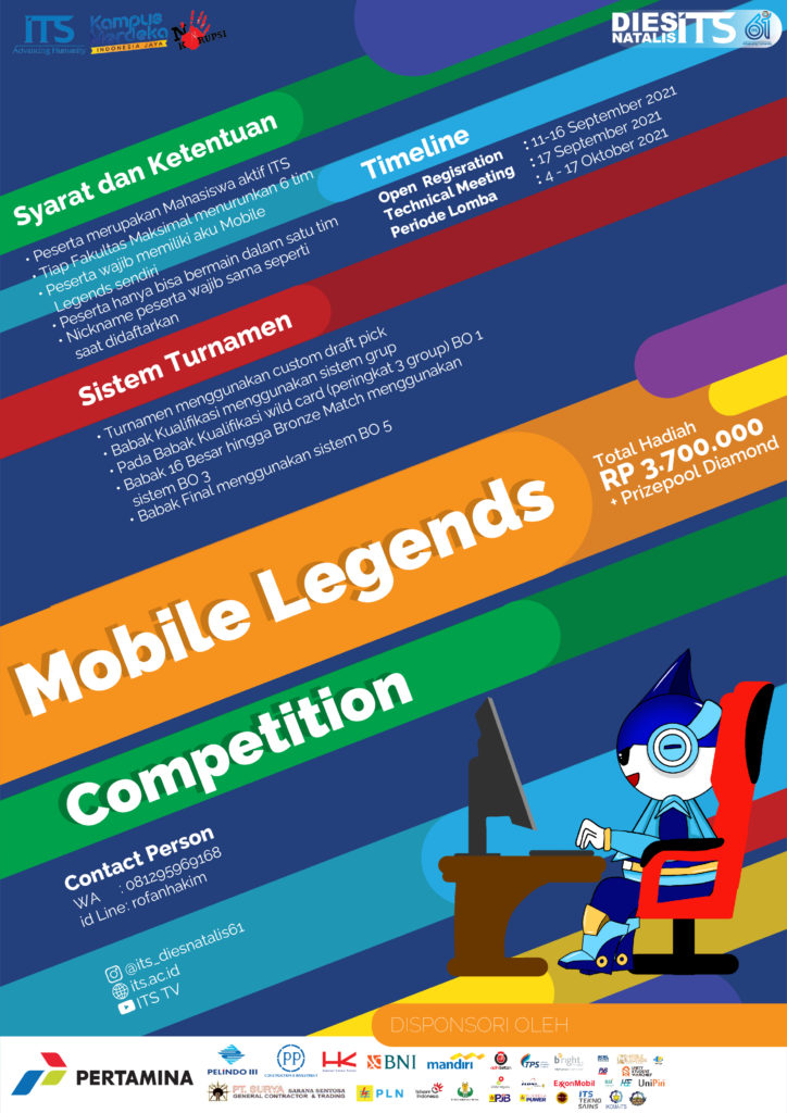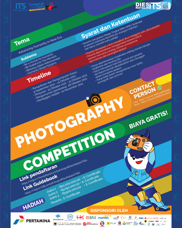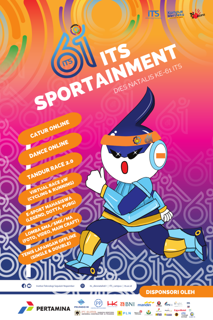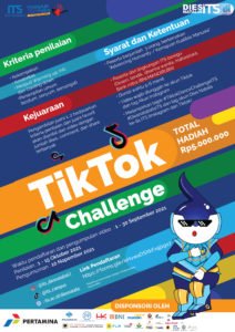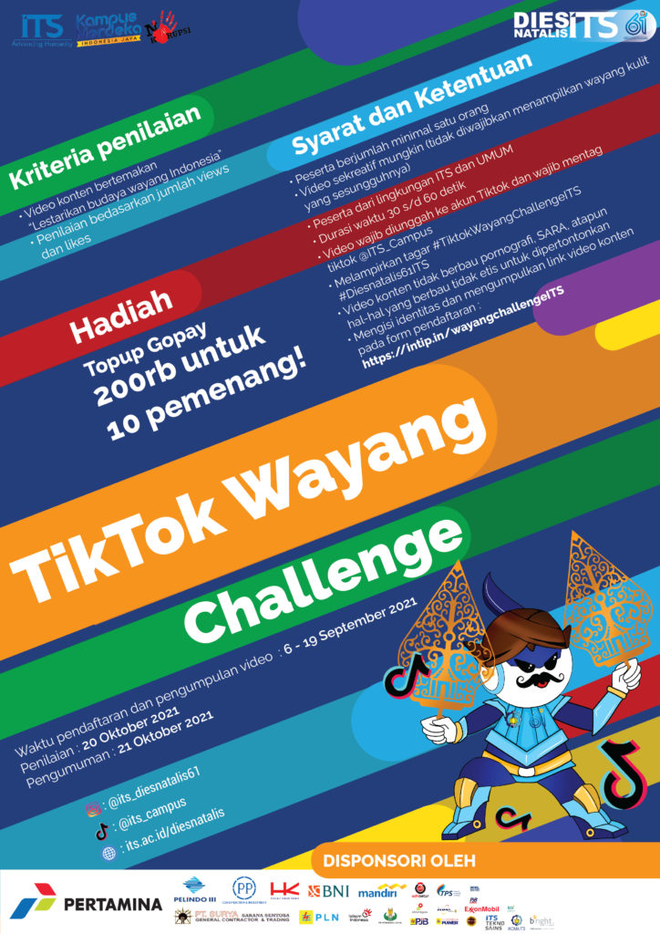 Yuk simak Syarat dan Ketentuannya! 1. Peserta berjumlah 3 orang 2. Peserta dari lingkungan ITS beregu seperti Dosen, Tendik, Dharma Wanita, Mahasiswa, Bank Mitra (BNI, Mandiri, BRI) 3. Konten dance bertemakan Advancing Humanity/Kemajuan Kualitas Manusia 4. Durasi waktu 5-6 menit 5. Konten diupload di Youtube dengan melampirkan tagar #ITSCampus #ITSSurabaya #DiesNatalisITS61 #VirtualChallengeITS 6. Memakai lagu bebas