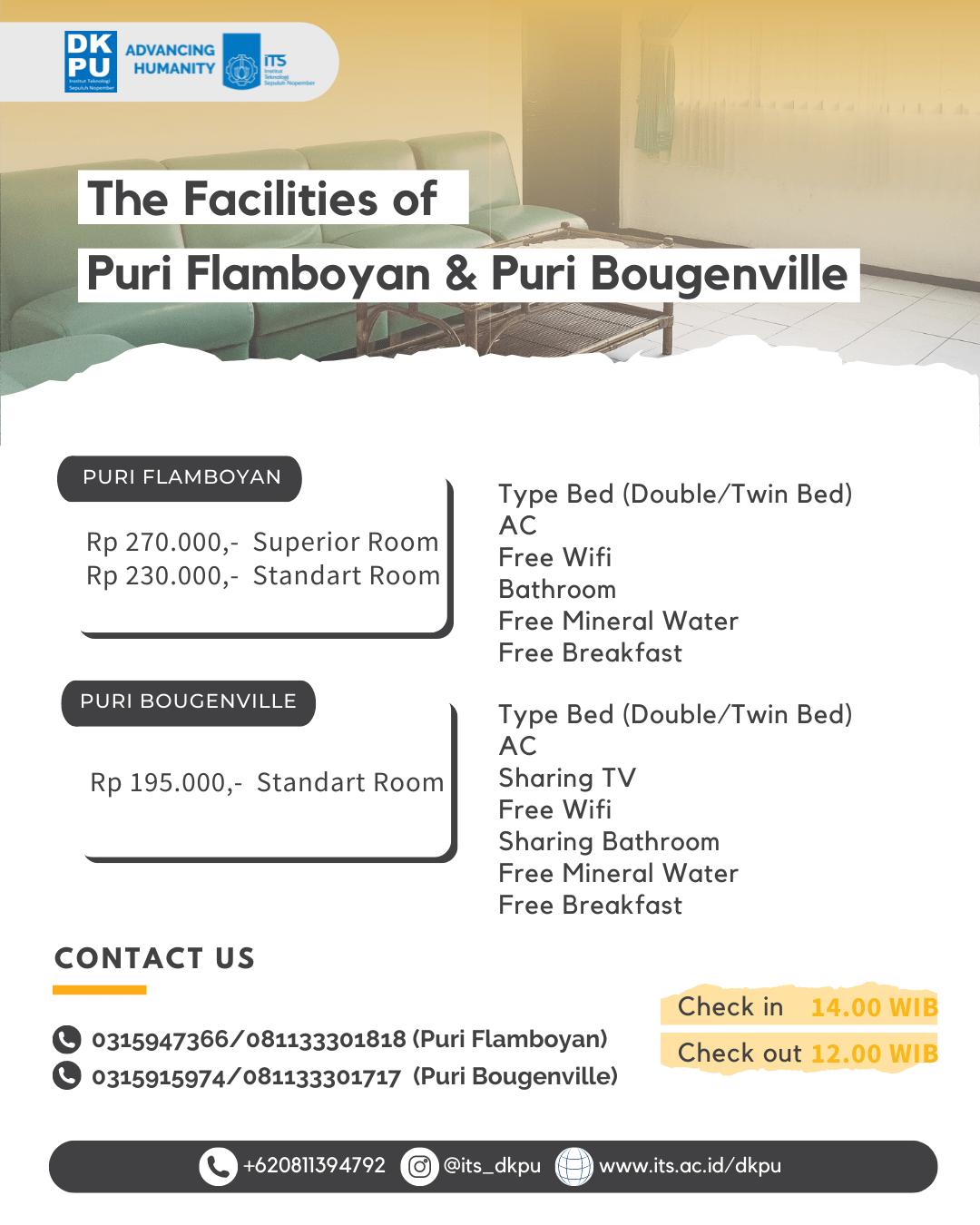 Towards the 126th of ITS Graduation, one of the important things is a place to stay close to “Graha ITS”. Puri Flamboyan and Puri Bougenville are have the closest access to Graha ITS. Currently, some rooms are still available with supporting facilities such as air-conditioner , TV, Wifi, mineral water and breakfast.