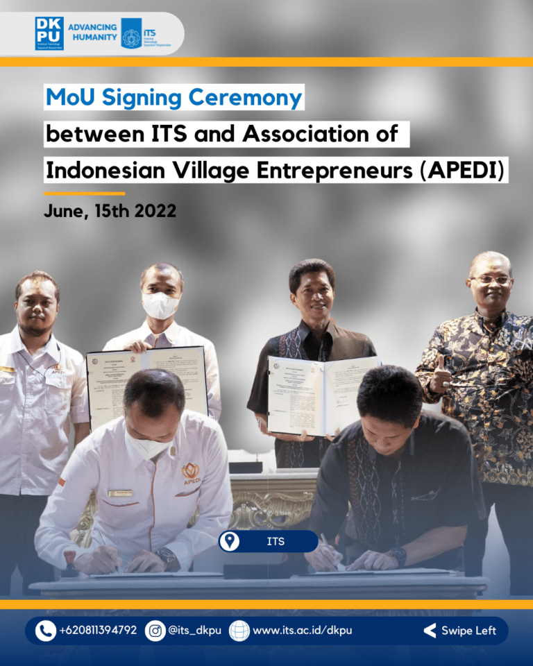 A Memorandum of Understanding (MoU) has been signed between ITS and the Association of Indonesian Village Entrepreneurs (APEDI). The collaboration plan is as follows: Village Entrepreneur Training Development of