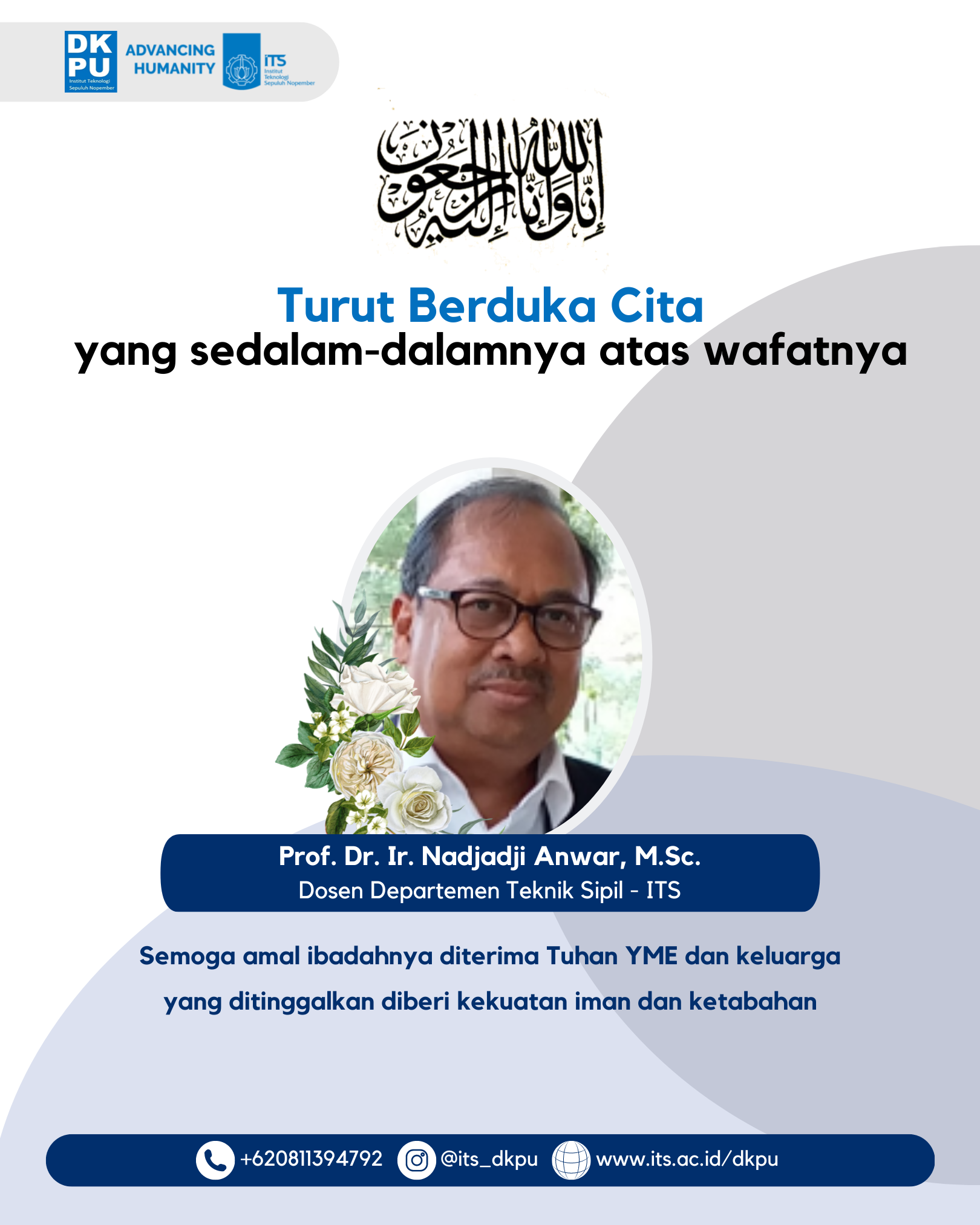 Keluarga besar DKPU ITS turut berduka cita yang sedalam-dalamnya atas wafatnya Bapak Prof. Dr. Ir. Nadjadji Anwar, M.Sc., Dosen Departemen Teknik Sipil – ITS. Semoga amal ibadah beliau diterima oleh Tuhan YME dan keluarga yang ditinggalkan senantiasa diberi kesabaran dan kekuatan. Amin
