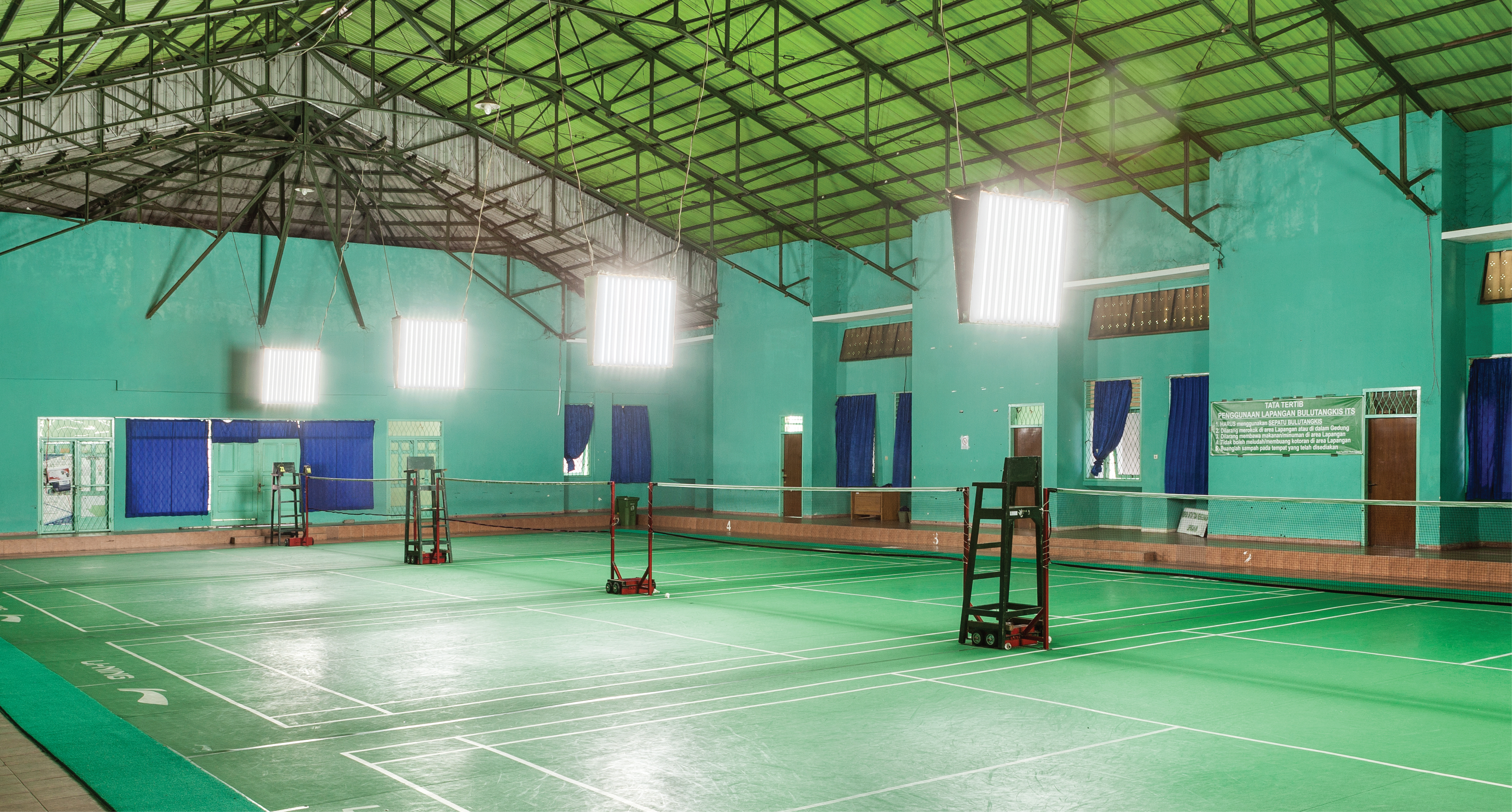 GOR Bulu Tangkis indoor dengan pencahayaan optimal.