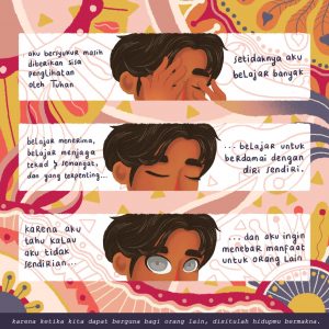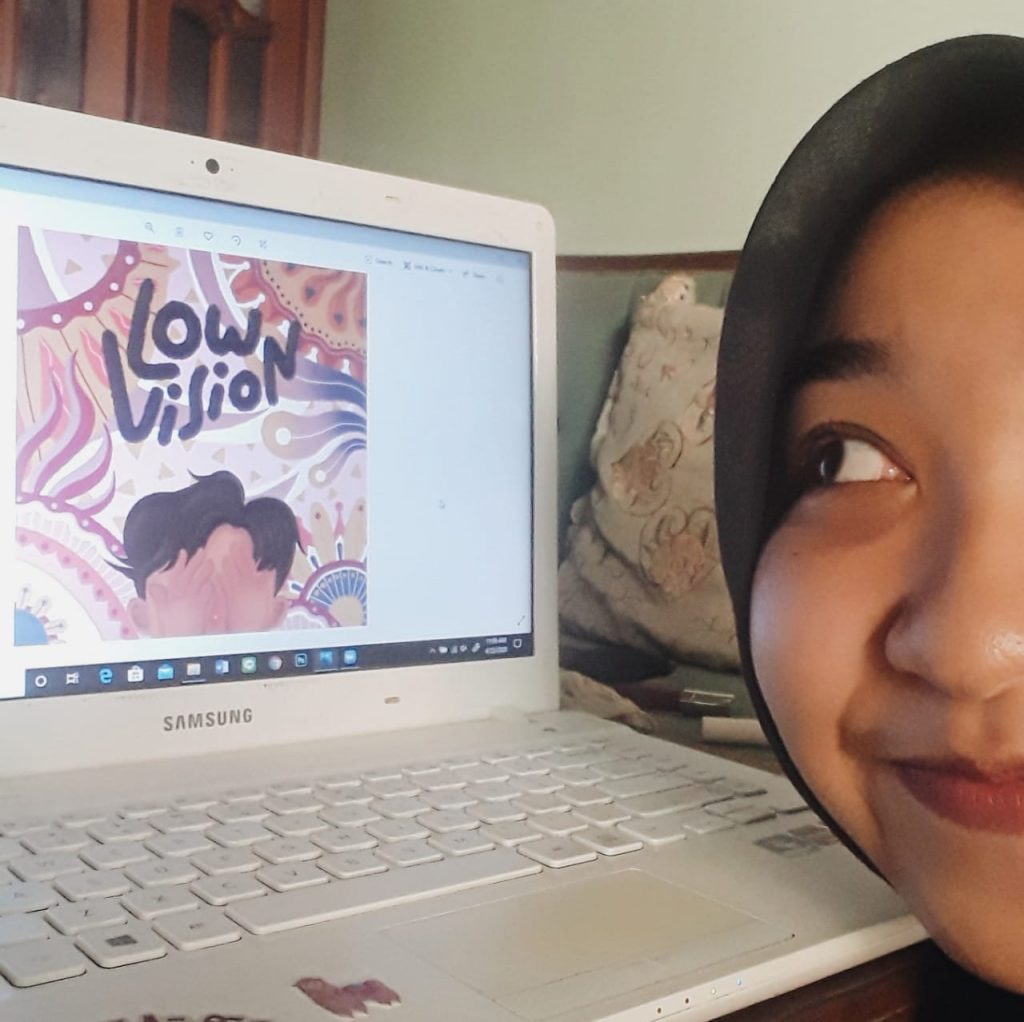 Gadis kelahiran 1 Maret 2000 ini mengaku tertohok dengan kisah si empunya cerita yang berkisah tentang pengalaman pribadinya tersebut. Bagi dirinya yang sangat lekat orientasi visualnya, sangat sulit untuk memvisualkan orang dengan kondisi low visual. “Tapi akhirnya, aku coba untuk brainstorming dari artikel tertentu supaya karyaku tidak menimbulkan kesan menyinggung pihak yang ada dalam kondisi tersebut,” ujarnya.