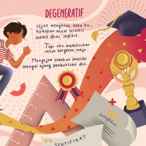 Dalam pembuatan karyanya ini, Lalak dipasangkan dengan Afif Husain Rasyidi dari Universitas Brawijaya yang membuat karya Kisah Inspiratif dengan judul Degeneratif. Kisah ini menceritakan tentang mimpi yang mulai terkikis karena low vision yang dialaminya. Sebuah kondisi di mana penglihatan seseorang mengalami batasan tertentu dalam melihat objek, tetapi akhirnya sang penulis memutuskan untuk belajar berdamai dengan dirinya sendiri dan berkeinginan menebar manfaat untuk orang lain.