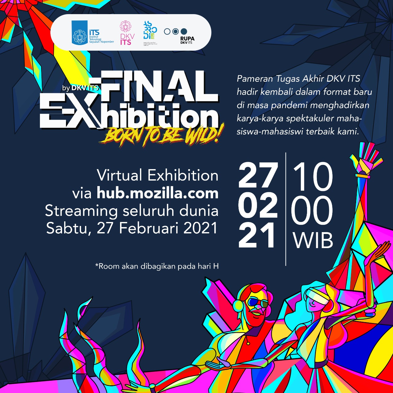 Salam DKV! Lama tak bersua, rindu bak di ujung penantian Pameran Tugas Akhir DKV ITS hadir kembali dalam format baru di masa pandemi menghadirkan karya-karya spektakuler mahasiswa-mahasiswi terbaik kami . FINALEXhibition, pameran pertama Tugas Akhir DKV ITS dengan tema Born To Be Wild! Lahir kembali menjadi insan-insan yang ‘liar’ kreatif dan inovatif memajukan kemanusiaan! . Serentak secara daring melalui hub.mozilla.com* Pada hari Sabtu, 27 Februari 2021, pukul 10.00 WIB *room akan dibagikan pada hari H . Hub.mozilla merupakan ruang virtual berisi karya-karya tugas akhir mahasiswa-mahasiswi DKV ITS bisa diakses menggunakan perangkat komputer desktop, perangkat VR atau smartphone. Pengunjung akan dibatasi maksimal 25 user, sehingga pengunjung ke 26 dan seterusnya dipersilahkan mengunjungi setelah user sebelumnya meninggalkan room. . Silahkan abadikan tangkap layar dan share melalui sosial media, sebarkan ke seluruh dunia, sampaikan bahwa kami tetap hadir ditengah-tengah dunia kreatif!
