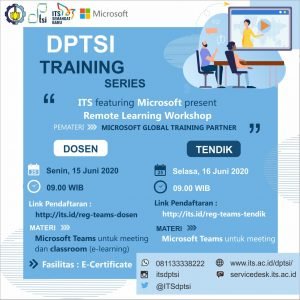 Bapak Ibu ysh, Menginformasikan DPTSI Training Series, dimana ITS bekerja sama dengan Microsoft mengadakan Remote Learning Workshop. Workshop dibagi menjadi 2 batch, yaitu: