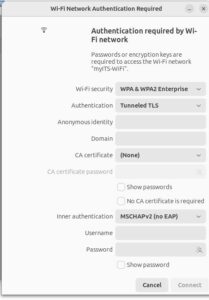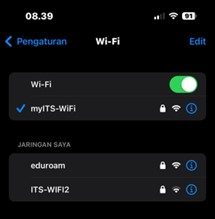 Bagaimana langkah untuk dapat mengakses internet? Koneksi Windows 10/111. Pilih icon Wi-Fi yang ada di pojok kanan bawah tampilan layar dan pastikan Wi-Fi menyala. 2. Cari SSID myITS-WiFi dan klik Connect. 3. Isi kolom username dengan email ITS yang berformat [NRP]@student.its.ac.id, contohnya: 501234567@student.its.ac.id dan gunakan password myITS. Lalu klik OK. 4.Klik tombol Connect -> Jika status myITS-Wifi sudah Connected, maka koneksi sudah terhubung. Koneksi Iphone 1. Nyalakan Wi-Fi di perangkat smartphone.2. Cari SSID myITS-WiFi. 3. Isi kolom username dengan email ITS yang berformat [NRP]@student.its.ac.id, contohnya: 501234567@student.its.ac.id dan gunakan password myITS. Lalu klik Join/Gabung. 4. Jika muncul Sertifikat, pilih Trust/Percayai. 5. Jika myITS-WiFi sudah centang biru, tandanya koneksi berhasil. Koneksi Android 1. Nyalakan Wi-Fi di perangkat smartphone.2. Cari SSID myITS-WiFi. 3. Isi kolom identitas dengan email ITS yang berformat [NRP]@student.its.ac.id, contohnya: 501234567@student.its.ac.id dan gunakan kata sandi myITS. 4. Pilih Sertifikat -> Do not validate/Jangan Validasi, atau No certificate is required/None (tergantung jenis perangkat yang digunakan). 5. Pada beberapa perangkat, terdapat pengaturan tambahan seperti pada gambar di bawah ini. Pada bagian Inner Authentication, pilih MSCHAPv2, kemudian klik Sambung/Connect. 6. Jika myITS-WiFi sudah muncul keterangan Connected/Terhubung, maka koneksi berhasil.