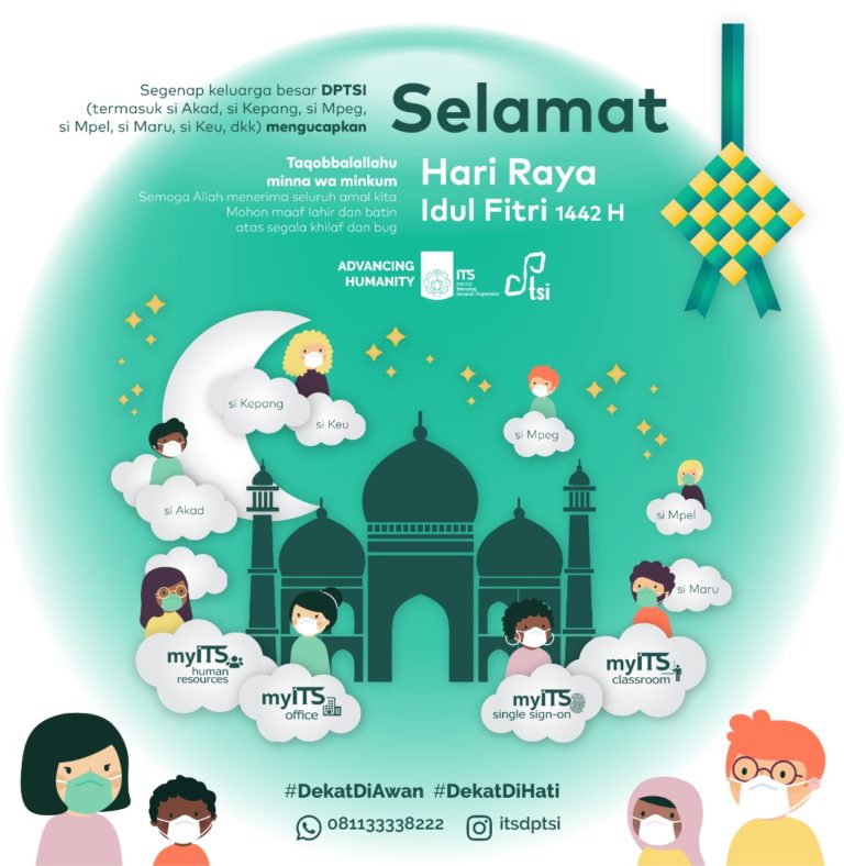 Menyambut Hari Raya Idul Fitri 1 Syawal 1442 H, segenap keluarga besar DPTSI mengucapkan selamat merayakan Hari Raya Idul Fitri 1442 H bagi seluruh civitas akademika ITS yang merayakan
