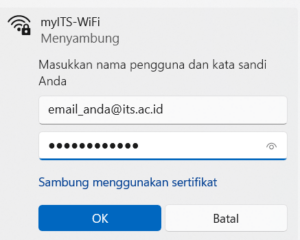 3. Isi kolom username dengan email ITS yang berformat [email_anda]@its.ac.id, contohnya: email_anda@its.ac.id dan isi kolom Password menggunakan password myITS. Lalu klik OK.