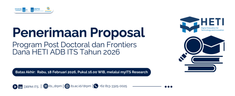 Sehubungan dengan pelaksanaan Program Post Doctoral dan Frontiers Dana HETI ADB ITS Tahun 2026, Direktorat Riset dan Pengabdian kepada Masyarakat (DRPM) Institut Teknologi Sepuluh Nopember (ITS) memberikan kesempatan kepada
