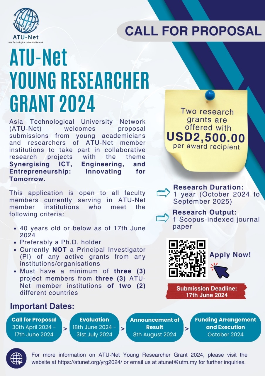 Program hibah proyek ATU-Net Young Researcher Grant 2024 (ATU-Net YRG 2024) telah dibuka. Dengan ini kami sampaikan kepada Bapak/Ibu peneliti muda Institut Teknologi Sepuluh Nopember bahwa terdapat peluang hibah dari luar negeri yang mengusung tema “Synergising ICT, Engineering, and Entrepreneurship: Innovating for Tomorrow”.