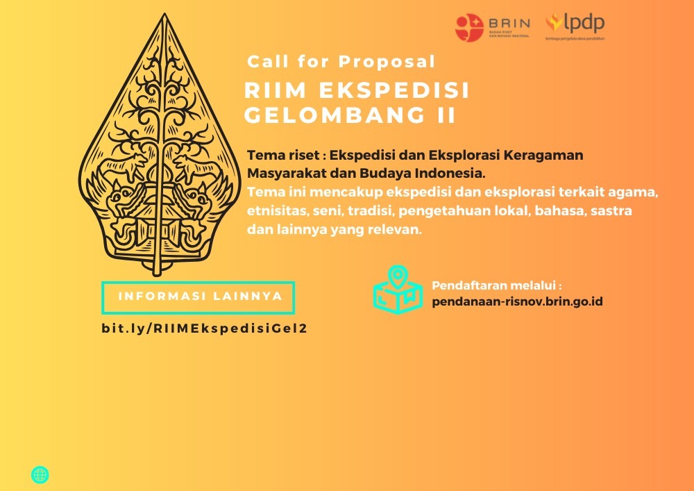 Program Pendanaan RIIM Ekspedisi Gelombang II bertema “Ekspedisi dan Eksplorasi Keragaman Masyarakat dan Budaya Indonesia”. Tema ini meliputi ekspedisi dan eksplorasi terkait dengan aspek-aspek seperti agama, etnisitas, seni, tradisi, pengetahuan lokal, bahasa, sastra, dan hal-hal lain yang relevan.