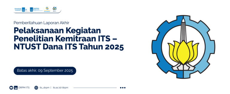 Sehubungan dengan jadwal pelaporan pelaksanaan Penelitian Kemitraan ITS – NTUST Dana ITS Tahun 2025, bersama ini kami mohon bantuan Bapak/Ibu berkenan menyampaikan kepada para ketua peneliti kegiatan tersebut (daftar