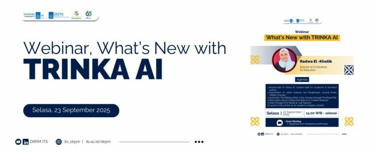 Dalam mendukung peningkatan kualitas penulisan akademik di lingkungan Institut Teknologi Sepuluh Nopember (ITS), kami mengundang Bapak/Ibu Kepala Departemen dan Mahasiswa Pascasarjana Institut Teknologi Sepuluh Nopember (ITS) untuk hadir dalam