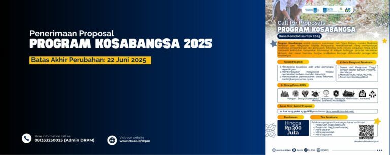 Dalam rangka mendukung kegiatan riset lanjutan dan peningkatan kapasitas akademik, Direktorat Riset dan Pengabdian kepada Masyarakat (DRPM) Institut Teknologi Sepuluh Nopember (ITS) membuka kesempatan bagi para dosen dan post