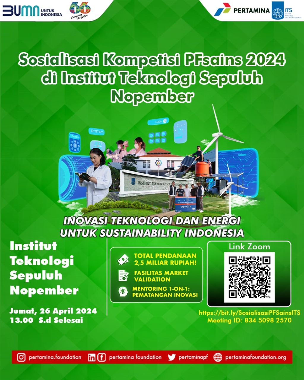 Mengharap dengan hormat kehadiran Bapak/Ibu dosen, tendik, dan mahasiswa peneliti di Institut Teknologi Sepuluh Nopember dalam kegiatan Sosiaisasi PFSains 2024 yang akan dilaksanakan oleh Direktorat Riset dan Pengabdian kepada Masyarakat pada: