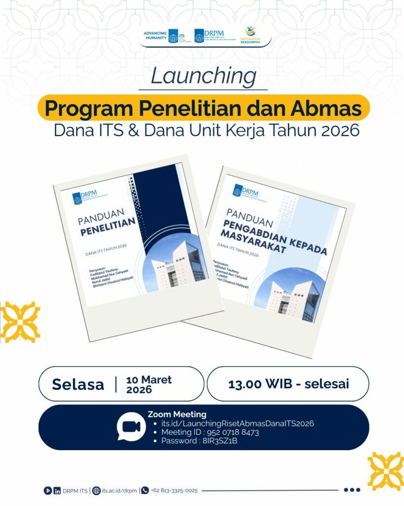 Direktorat Riset dan Pengabdian kepada Masyarakat (DRPM) Institut Teknologi Sepuluh Nopember (ITS) akan menyelenggarakan kegiatan Launching Program Penelitian dan Pengabdian kepada Masyarakat (Abmas) Dana ITS dan Dana Unit Kerja Tahun 2026.