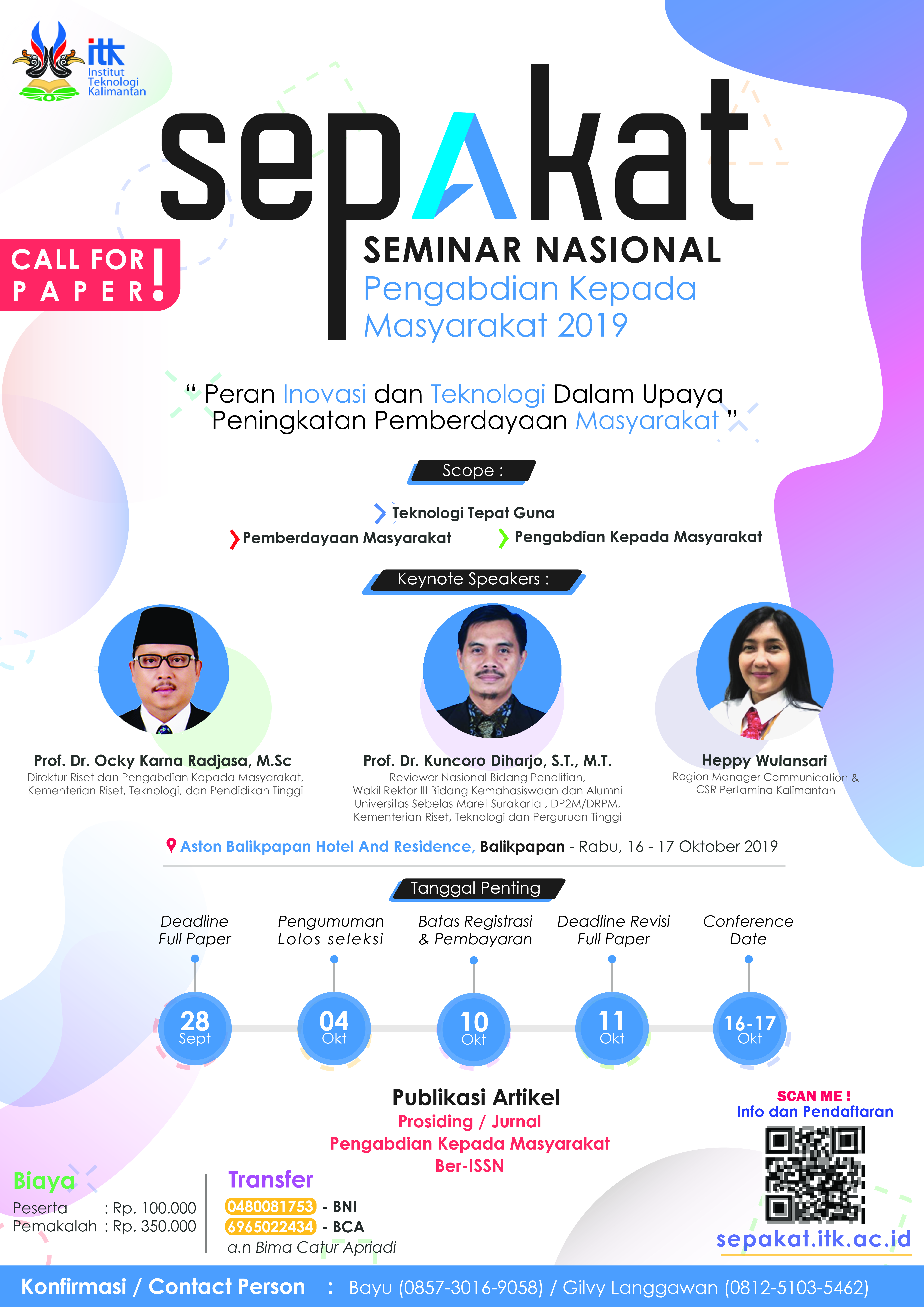 We hereby inform you that the ITK campus will hold the 2019 National Seminar on Community Service (SEPAKAT). The plan for holding SEPAKAT 2019 is on 16-17 October 2019 at Aston Balikpapan Hotel and Residences. For more information regarding registration, please visit the page : sepakat.itk.ac.id