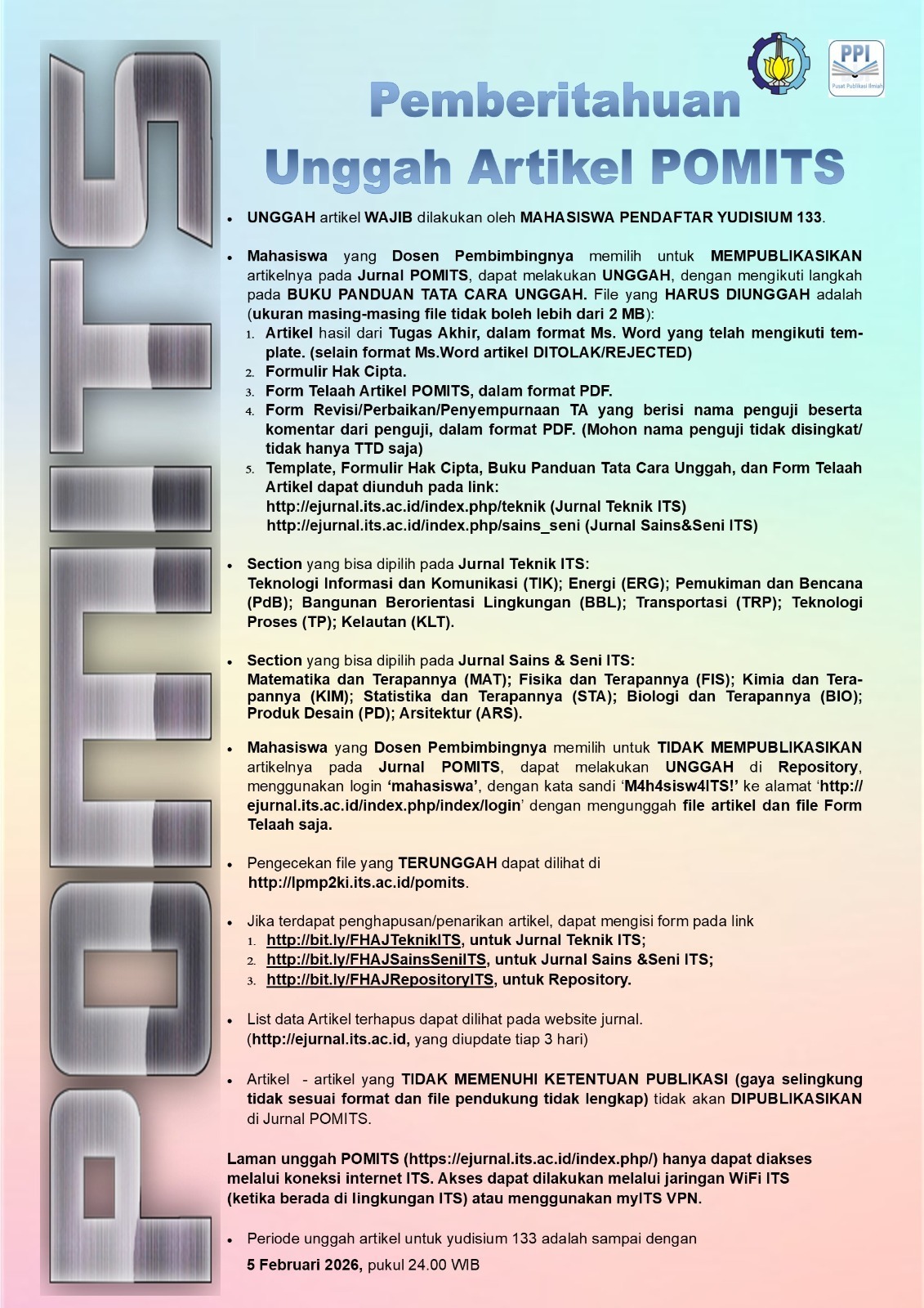 Diharapkan kepada seluruh mahasiswa yang terdaftar untuk mengikuti Wisuda 133 untuk mengunggah artikel pada Jurnal POMITS sesuai dengan panduan yang telah ditetapkan.