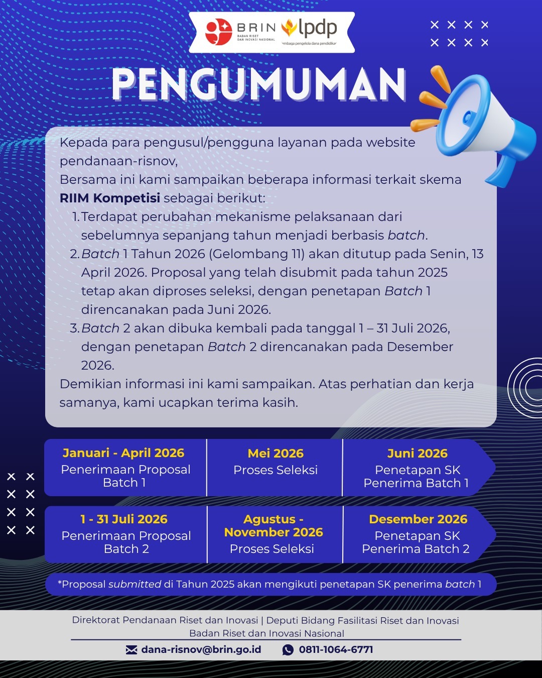 Sehubungan dengan pengumuman dari Deputi Bidang Fasilitasi Riset dan Inovasi, Badan Riset dan Inovasi Nasional (BRIN) terkait skema penerimaan proposal program Riset dan Inovasi untuk Indonesia Maju (RIIM) Kompetisi Tahun 2026, bersama ini kami sampaikan beberapa informasi penting sebagai berikut: