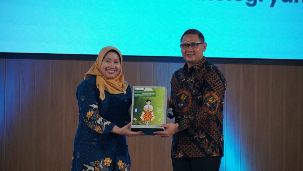 Image: Chair of the ATID 2025 Committee, Prof. Dr. Diana Purwitasari, S.Kom., M.Sc. (left), symbolically handing over a policy brief and AI usage policy guidelines for senior high schools to the Head of the East Java Provincial Education Office, Dr. Aries Agung Paewai, S.STP., M.M.