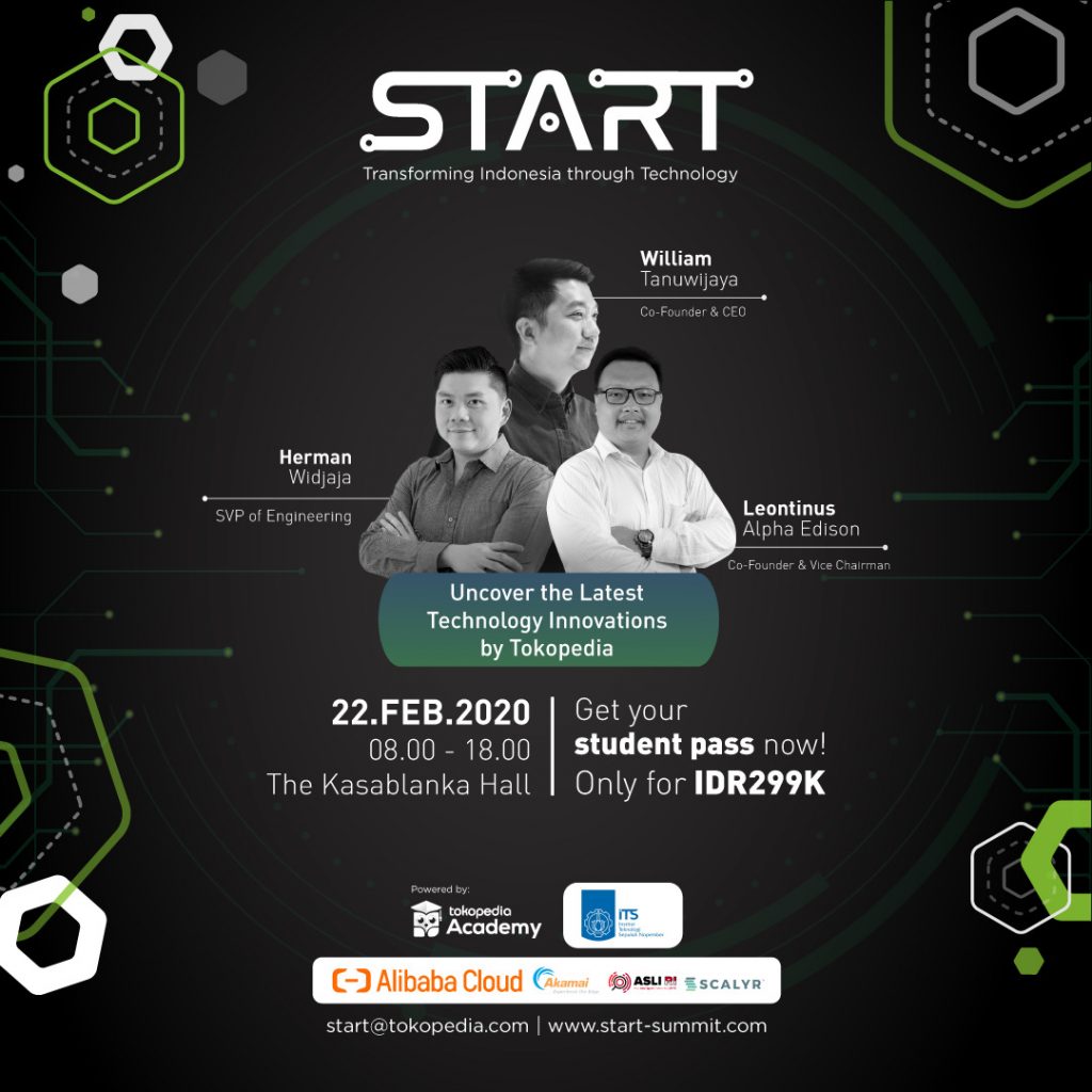 Event START (Transforming Indonesia through Technology) Theme Transforming Indonesia through Technology Date February 22nd, 2020 Time 08.00 – 18.00 Location The Kasablanka Hall PIC Tokopedia Contact https://start-summit.com Best known as the home of technology breakthroughs and innovations, Tokopedia is thrilled to introduce START, our very first technology summit in 2020. START is a one-day technology […]